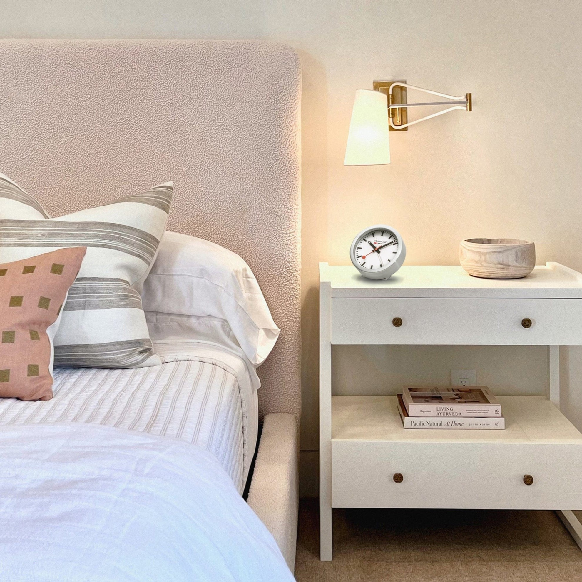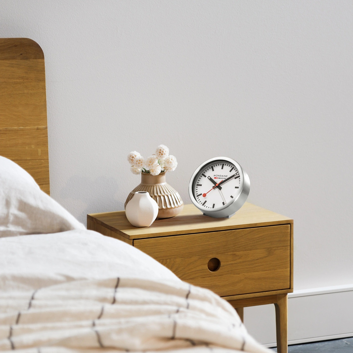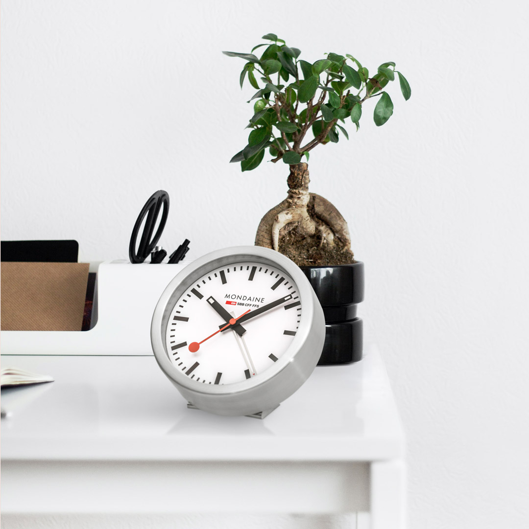 MONDAINE A997.MCAL.16SBB.1 jsou nástěnné hodiny s hliníkovým pouzdrem o průměru 125 milimetrů, které lze využít také jako stolní hodiny. Číselník v matné bílé barvě je chráněn tvrzeným minerálním sklem a je inspirován ikonickými nádražními hodinami s červenou sekundovou ručkou. Konce hodinové a minutové ručky disponují luminiscenčním nátěrem, který usnadňuje čitelnost ve tmě. Chod hodin zajišťuje quartzový strojek s funkcí budíku.