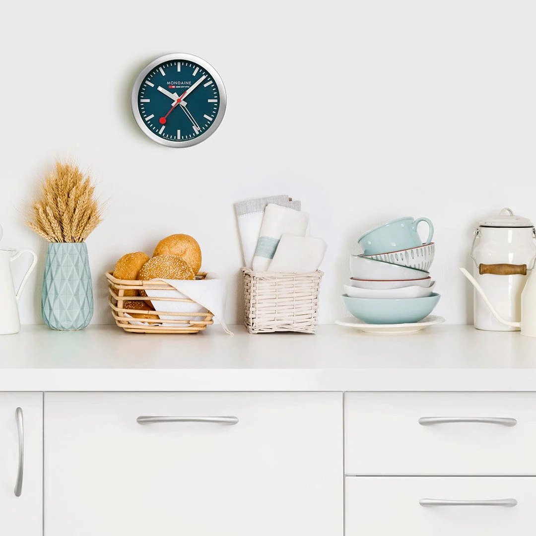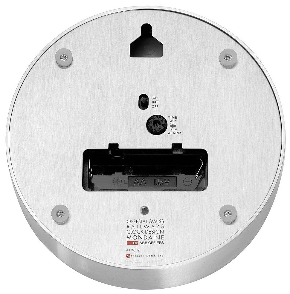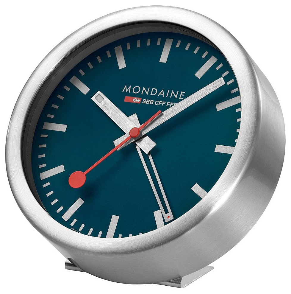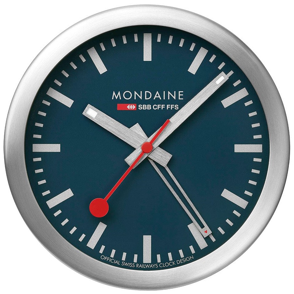 MONDAINE A997.MCAL.46SBV.1 jsou nástěnné hodiny s hliníkovým pouzdrem o průměru 125 milimetrů, které lze využít také jako stolní hodiny. Číselník v matné tmavě modré barvě je chráněn tvrzeným minerálním sklem a je inspirován ikonickými nádražními hodinami s červenou sekundovou ručkou. Konce hodinové a minutové ručky disponují luminiscenčním nátěrem, který usnadňuje čitelnost ve tmě. Chod hodin zajišťuje quartzový strojek s funkcí budíku.