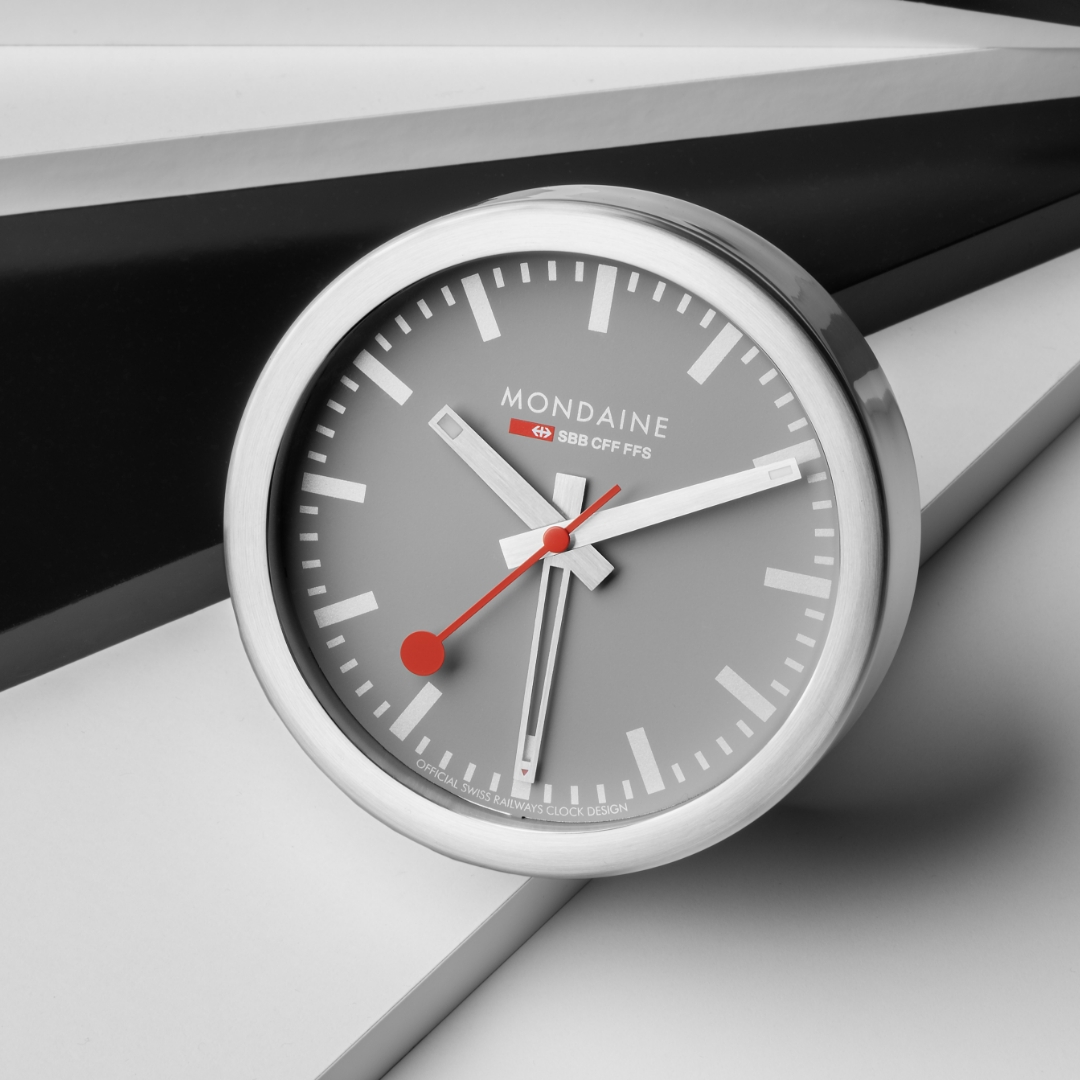 MONDAINE A997.MCAL.86SBV jsou nástěnné hodiny s hliníkovým pouzdrem o průměru 125 milimetrů, které lze využít také jako stolní hodiny. Číselník v matné šedé barvě je chráněn tvrzeným minerálním sklem a je inspirován ikonickými nádražními hodinami s červenou sekundovou ručkou. Konce hodinové a minutové ručky disponují luminiscenčním nátěrem, který usnadňuje čitelnost ve tmě. Chod hodin zajišťuje quartzový strojek s funkcí budíku.