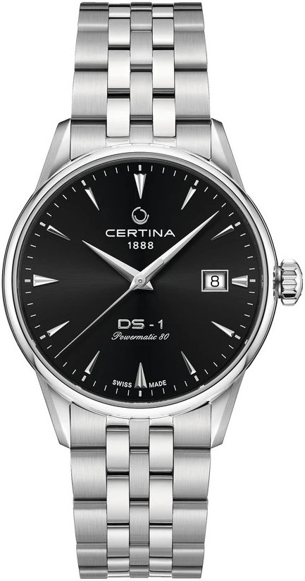 Certina DS-1 38mm C029.207.11.051.00 jsou pánské automatické hodinky na ocelovém náramku s motýlkovou sponou inspirované prvním konceptem hodinek DS vyrobeným Certinou v roce 1960. Pouzdro z nerezové oceli v kombinaci brusu a lesku má průměr 38 milimetrů a průhledné dýnko. Černý číselník s indikací data na třetí hodině je chráněn odolným safírovým sklem s antireflexní vrstvou. Aplikované hodinové indexy jsou doplněny elegantními dauphine ručkami. Pohon hodinek zajišťuje mechanický strojek Powermatic 80.611 s automatickým nátahem a rezervou chodu přibližně 80 hodin. Tento strojek s funkcí hackingu lze v případě potřeby natahovat i ručně pomocí signované korunky. Model disponuje technologií DS (Double Security) používanou a zdokonalovanou již od roku 1959, díky které mají hodinky zvýšenou odolnost vůči nárazům a vodě. Vodotěsnost hodinek činí 10 ATM a jsou tedy vhodné pro koupání nebo šnorchlování.