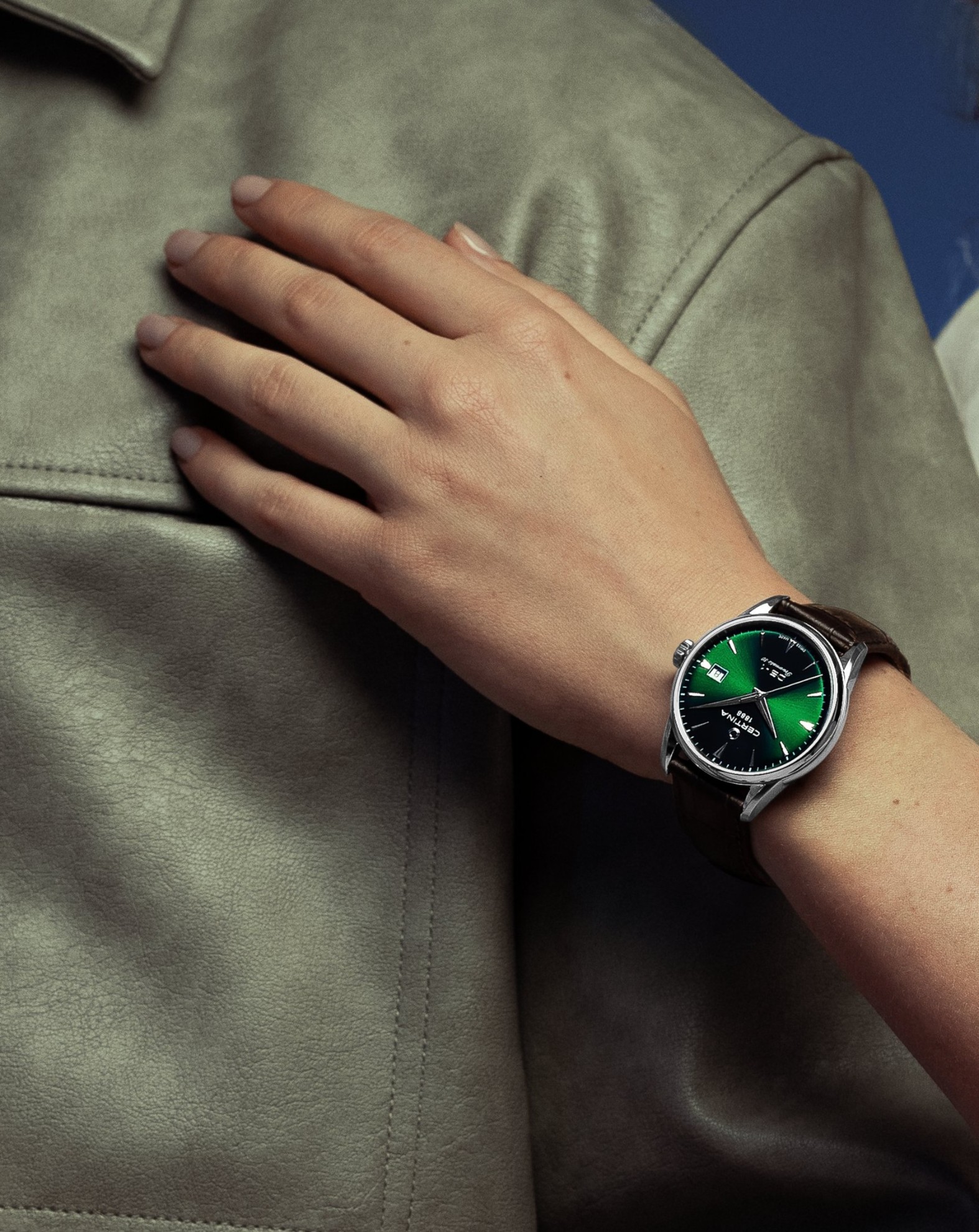 Certina DS-1 38mm C029.207.16.091.00 jsou pánské automatické hodinky na hnědém koženém řemínku s motýlkovou sponou inspirované prvním konceptem hodinek DS vyrobeným Certinou v roce 1960. Pouzdro z nerezové oceli v kombinaci brusu a lesku má průměr 38 milimetrů a průhledné dýnko. Zelený číselník s efektem slunečního brusu a indikací data na třetí hodině je chráněn odolným safírovým sklem s antireflexní vrstvou. Aplikované hodinové indexy jsou doplněny elegantními dauphine ručkami. Pohon hodinek zajišťuje mechanický strojek Powermatic 80.611 s automatickým nátahem a rezervou chodu přibližně 80 hodin. Tento strojek s funkcí hackingu lze v případě potřeby natahovat i ručně pomocí signované korunky. Model disponuje technologií DS (Double Security) používanou a zdokonalovanou již od roku 1959, díky které mají hodinky zvýšenou odolnost vůči nárazům a vodě. Vodotěsnost hodinek činí 10 ATM a jsou tedy vhodné pro koupání nebo šnorchlování.