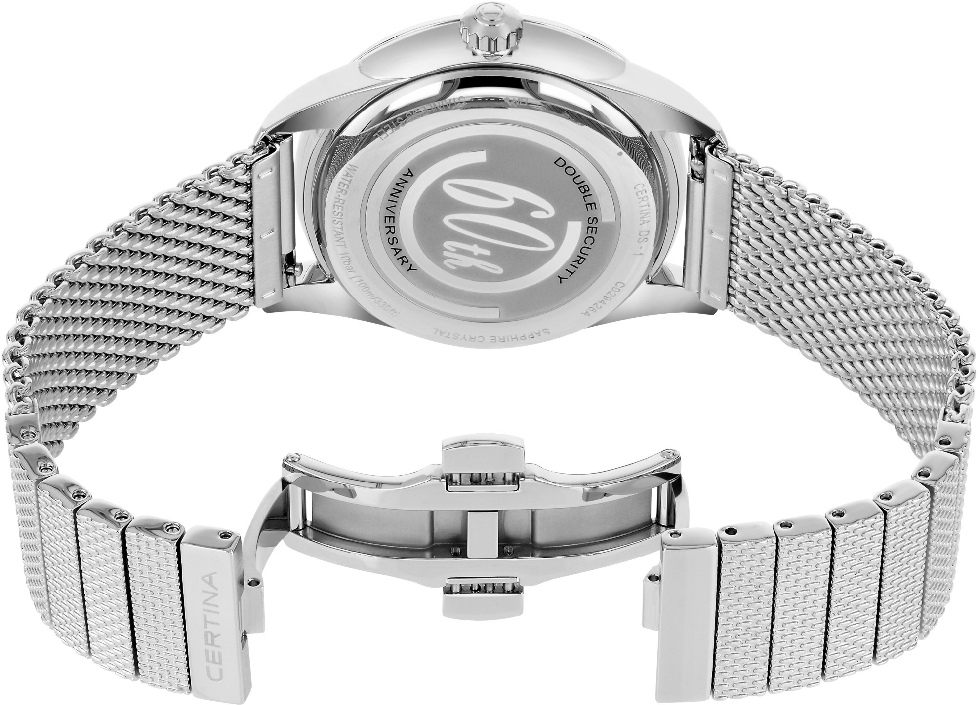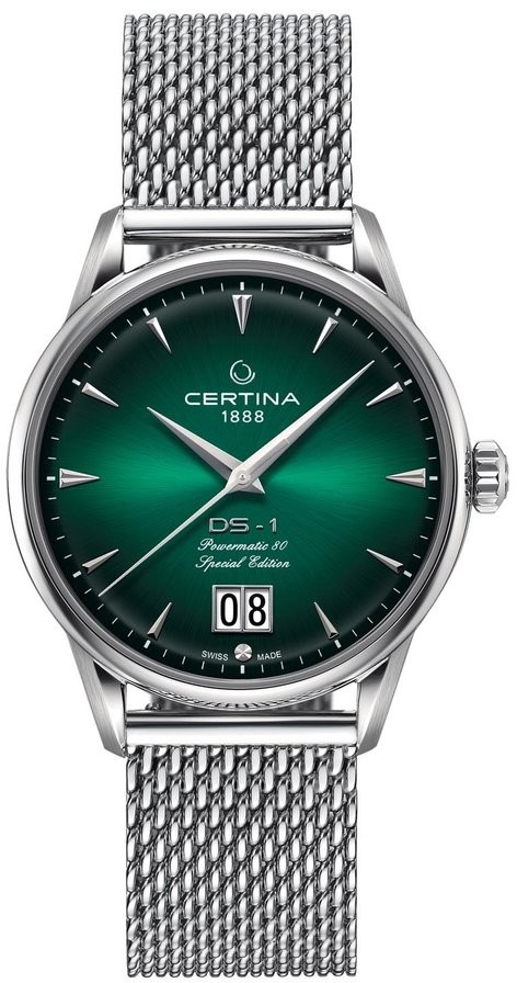 Certina DS-1 Big Date 60th Anniversary Special Edition C029.426.11.091.60 jsou pánské automatické hodinky na kovovém milánském tahu s motýlkovou sponou inspirované prvním konceptem hodinek DS vyrobeným Certinou v roce 1960. Pouzdro z nerezové oceli v kombinaci brusu a lesku má průměr 41 milimetrů. Motiv na dýnku značí, že jedná se o speciální edici vydanou k příležitosti výročí 60 let od zavedení konceptu DS. Zelený gradientní číselník s indikací data v provedení Big Date na šesté hodině je kryt odolným safírovým sklem s antireflexní vrstvou. Aplikované hodinové indexy jsou doplněny elegantními dauphine ručkami. Pohon hodinek zajišťuje mechanický strojek Powermatic 80.651 s automatickým nátahem a rezervou chodu přibližně 80 hodin. Kalibr je vybaven vláskem setrvačky Nivachron™, což je speciální antimagnetický materiál, díky kterému jsou hodinky velmi odolné vůči magnetickým polím.Tento strojek s funkcí hackingu lze v případě potřeby natahovat i ručně pomocí signované korunky. Model disponuje technologií DS (Double Security) používanou a zdokonalovanou již od roku 1959, díky které mají hodinky zvýšenou odolnost vůči nárazům a vodě. Vodotěsnost hodinek činí 10 ATM a jsou tedy vhodné pro koupání nebo šnorchlování.