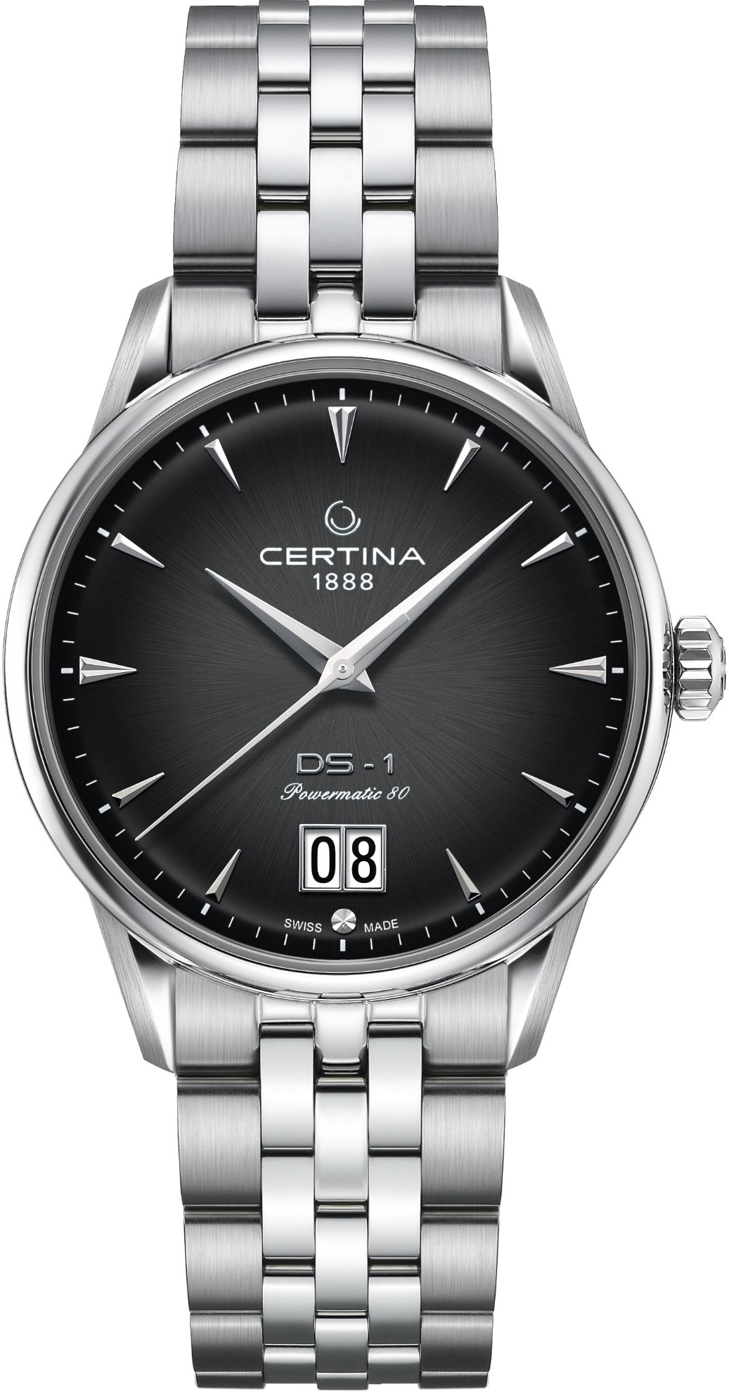 Certina DS-1 Big Date Powermatic 80 C029.426.11.051.00 jsou pánské automatické hodinky na kovovém náramku v kombinaci brusu a lesku s motýlkovou sponou inspirované prvním konceptem hodinek DS vyrobeným Certinou v roce 1960. Pouzdro z nerezové oceli má průměr 41 milimetrů a průhledné dýnko. Černý gradientní číselník s indikací data v provedení Big Date na šesté hodině je kryt odolným safírovým sklem s antireflexní vrstvou. Aplikované hodinové indexy jsou doplněny elegantními dauphine ručkami. Pohon hodinek zajišťuje mechanický strojek Powermatic 80.651 s automatickým nátahem a rezervou chodu přibližně 80 hodin. Kalibr je vybaven vláskem setrvačky Nivachron™, což je speciální antimagnetický materiál, díky kterému jsou hodinky velmi odolné vůči magnetickým polím.Tento strojek s funkcí hackingu lze v případě potřeby natahovat i ručně pomocí signované korunky. Model disponuje technologií DS (Double Security) používanou a zdokonalovanou již od roku 1959, díky které mají hodinky zvýšenou odolnost vůči nárazům a vodě. Vodotěsnost hodinek činí 10 ATM a jsou tedy vhodné pro koupání nebo šnorchlování.