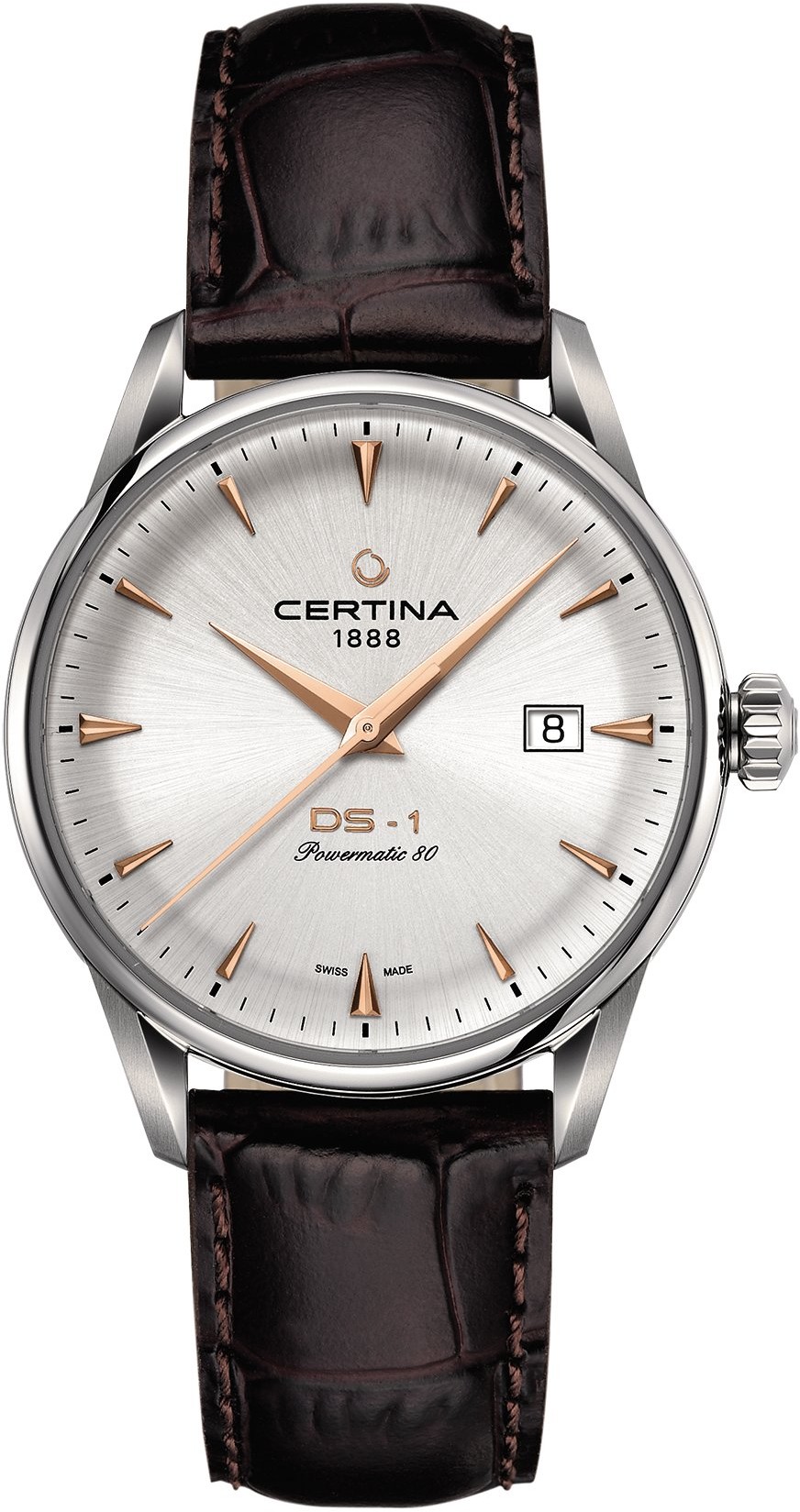 Certina DS-1 Powermatic 80 C029.807.16.031.01 jsou pánské automatické hodinky na koženém řemínku s motýlkovou sponou inspirované prvním konceptem hodinek DS vyrobeným Certinou v roce 1960. Pouzdro z nerezové oceli v kombinaci brusu a lesku má průměr 40 milimetrů a průhledné dýnko. Stříbrný číselník s efektem slunečního brusu a indikací data je kryt odolným safírovým sklem s antireflexní vrstvou. Aplikované hodinové indexy jsou společně s elegantními dauphine ručkami vyvedeny v barvě růžového zlata. Pohon hodinek zajišťuje mechanický strojek Powermatic 80.111 s automatickým nátahem a rezervou chodu přibližně 80 hodin. Tento strojek s funkcí hackingu lze v případě potřeby natahovat i ručně pomocí signované korunky. Model disponuje technologií DS (Double Security) používanou a zdokonalovanou již od roku 1959, díky které mají hodinky zvýšenou odolnost vůči nárazům a vodě. Vodotěsnost hodinek činí 10 ATM a jsou tedy vhodné pro koupání nebo šnorchlování.