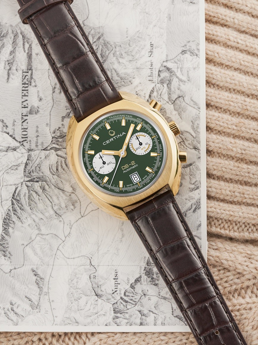 Certina DS-2 Chronograph Automatic C024.462.36.091.00 jsou pánské automatické hodinky na hnědém koženém řemínku s motýlkovou sponou, které byly inspirovány modelem DS-2, jehož kvality byly prověřeny i v průběhu expedice na Mount Everest. Pouzdro z nerezové oceli se zlatou povrchovou PVD úpravou ve tvaru „tonneau“, elipsy zakončené na obou koncích, má průměr 43,36 milimetru a průhledné dýnko. Zelený číselník ve vintage designu s indikací data a funkcí chronografu je chráněn klenutým safírovým sklem s antireflexní vrstvou. Aplikované hodinové indexy jsou spolu s ručkami pokryty luminiscenčním nátěrem Super-LumiNova®, který garantuje perfektní čitelnost za zhoršených světelných podmínek. Prvky ve žluté barvě nalezneme na číselníku i řemínku. Pohon hodinek zajišťuje mechanický strojek ETA A05.231 s automatickým nátahem a rezervou chodu přibližně 68 hodin. Kalibr je vybaven křemíkovým vláskem setrvačky, který hodinkám propůjčuje vysokou rezistenci vůči magnetickým polím. Tento strojek s funkcí hackingu lze v případě potřeby natahovat i ručně pomocí signované korunky. Model disponuje technologií DS (Double Security) používanou a zdokonalovanou již od roku 1959, díky které mají hodinky zvýšenou odolnost vůči nárazům a vodě. Vodotěsnost hodinek činí 20 ATM a jsou vhodnou volbou pro šnorchlování a potápění.