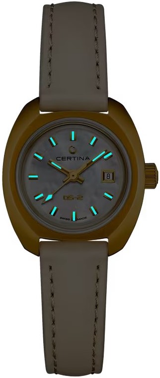 Certina DS-2 Lady Powermatic 80 C024.207.36.111.00 jsou elegantní dámské automatické hodinky na koženém řemínku béžové barvy s motýlkovou sponou, které navazují na populární spolehlivý model DS-2 z roku 1968. Pouzdro z nerezové oceli ve tvaru „tonneau“, elipsy zakončené na obou koncích, má průměr 24,8 milimetru, PVD úpravu zlaté barvy a průhledné dýnko. Perleťový číselník s indikací data je chráněn klenutým safírovým sklem s antireflexní vrstvou a jeho krása vyniká zejména pod přímým světlem, kdy můžeme pozorovat hru barev perleti. Aplikované hodinové indexy a ručky ve zlaté barvě jsou pokryty luminiscenčním nátěrem Super-LumiNova®, který garantuje perfektní čitelnost za zhoršených světelných podmínek. Pohon hodinek zajišťuje mechanický strojek Powermatic 48.111 s automatickým nátahem a rezervou chodu přibližně 48 hodin. Díky vlásku setrvačky Nivachron, což je speciální antimagnetický materiál, jsou hodinky velmi odolné vůči magnetickým polím. Tento strojek s funkcí hackingu lze v případě potřeby natahovat i ručně pomocí signované korunky. Model disponuje technologií DS (Double Security) používanou a zdokonalovanou již od roku 1959, která zajišťuje vyšší odolnost vůči nárazům a vodě. Vodotěsnost hodinek činí 10 ATM a jsou tedy vhodné pro koupání nebo šnorchlování.