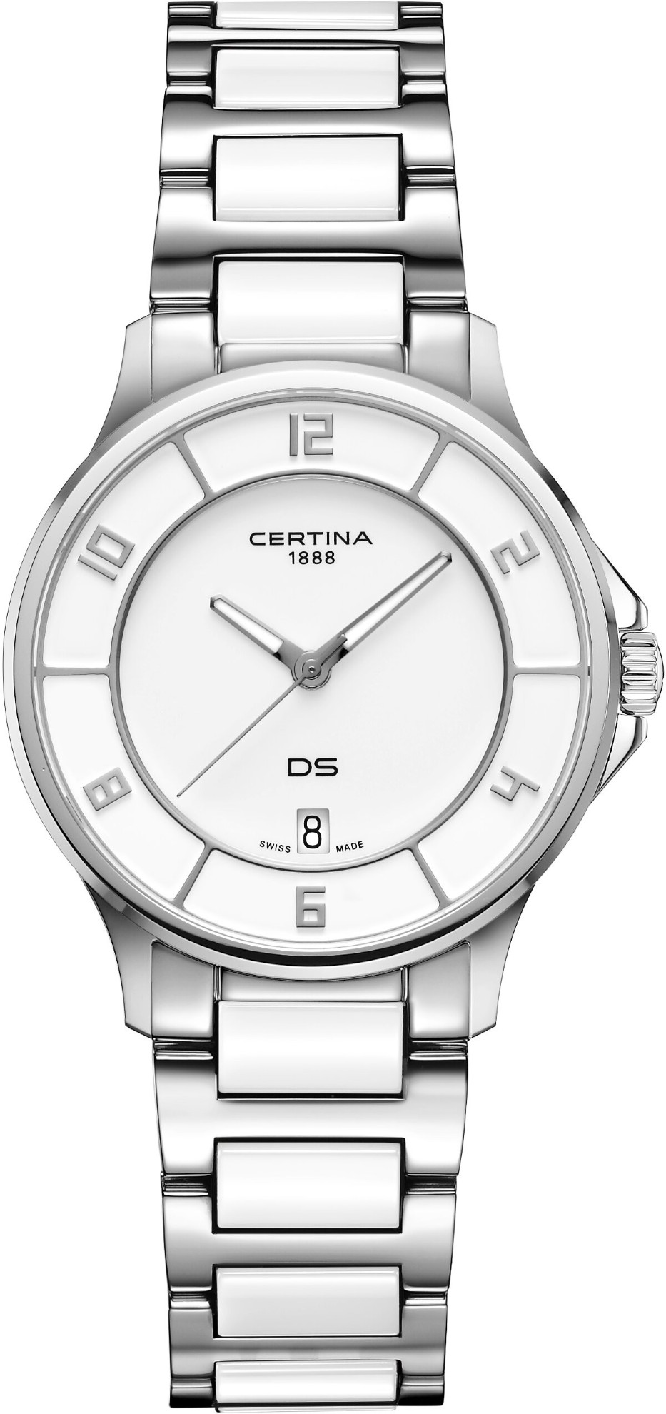 Certina DS-6 Lady C039.251.11.017.00 jsou dámské bateriové hodinky na bicolor náramku kombinujícím ocel a keramiku s motýlkovou sponou. Pouzdro z nerezové oceli v kombinaci brusu a lesku má průměr 35 milimetrů a dýnko s logem ve tvaru želvy, které reprezentuje robustnost a dlouhou životnost hodinek Certina. Bílý číselník s indikací data je chráněn odolným safírovým sklem. Aplikované hodinové indexy jsou doplněny ručkami pokrytými luminiscenčním nátěrem Super-LumiNova®, který garantuje perfektní čitelnost za zhoršených světelných podmínek. Pohon hodinek zajišťuje bateriový strojek ETA F05.412 s technologií Precidrive s přesností +/- 10 sekund za rok a indikací slabé baterie. Hodinky s C.O.S.C. certifikací, která je zárukou vysoké přesnosti nesou označení „Chronometer“. Model disponuje technologií DS (Double Security) používanou a zdokonalovanou již od roku 1959, díky které jsou hodinky odolnější vůči nárazům a mají zvýšenou voděodolnost. Vodotěsnost hodinek činí 10 ATM a jsou tedy vhodné pro koupání nebo šnorchlování.
