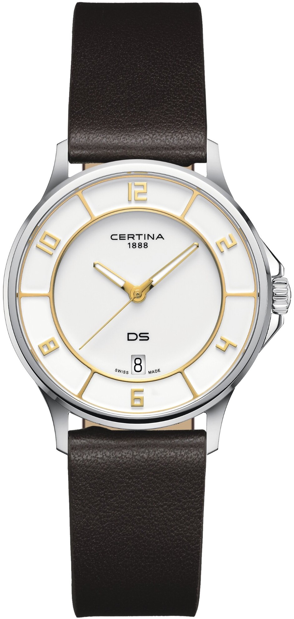Certina DS-6 Lady C039.251.17.017.01 jsou dámské bateriové hodinky na řemínku z recyklovaných plastových lahví a veganské kůže z jablek. Pouzdro z nerezové oceli v kombinaci brusu a lesku má průměr 35 milimetrů a dýnko s logem ve tvaru želvy, které reprezentuje robustnost a dlouhou životnost hodinek Certina. Bílý číselník s indikací data je chráněn odolným safírovým sklem. Zlaté hodinové indexy jsou doplněny ručkami v identické barvě pokrytými luminiscenčním nátěrem Super-LumiNova®, který garantuje perfektní čitelnost za zhoršených světelných podmínek. Pohon hodinek zajišťuje bateriový strojek ETA F05.412 s technologií Precidrive s přesností +/- 10 sekund za rok a indikací slabé baterie. Hodinky s C.O.S.C. certifikací, která je zárukou vysoké přesnosti nesou označení „Chronometer“. Model disponuje technologií DS (Double Security) používanou a zdokonalovanou již od roku 1959, díky které jsou hodinky odolnější vůči nárazům a mají zvýšenou voděodolnost. Vodotěsnost hodinek činí 10 ATM a jsou tedy vhodné pro koupání nebo šnorchlování.