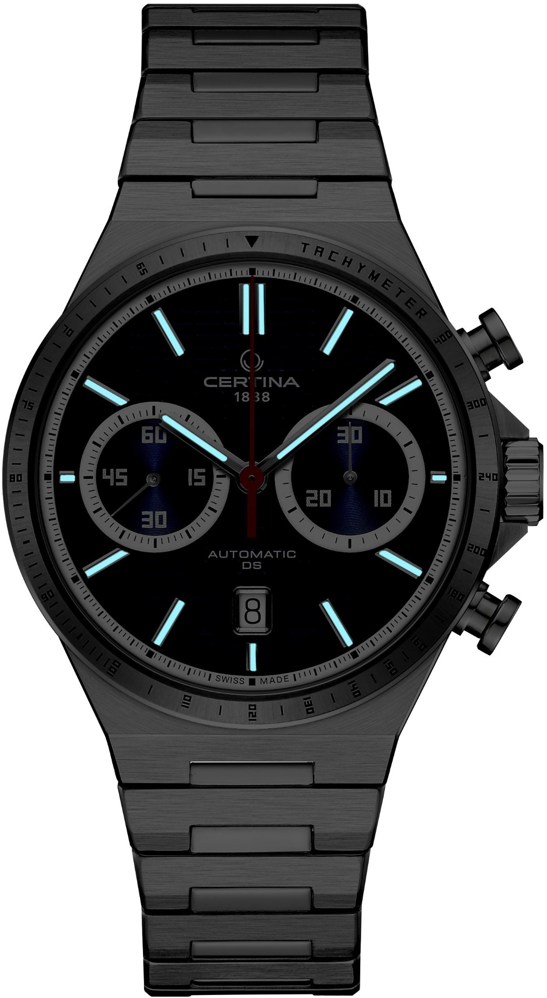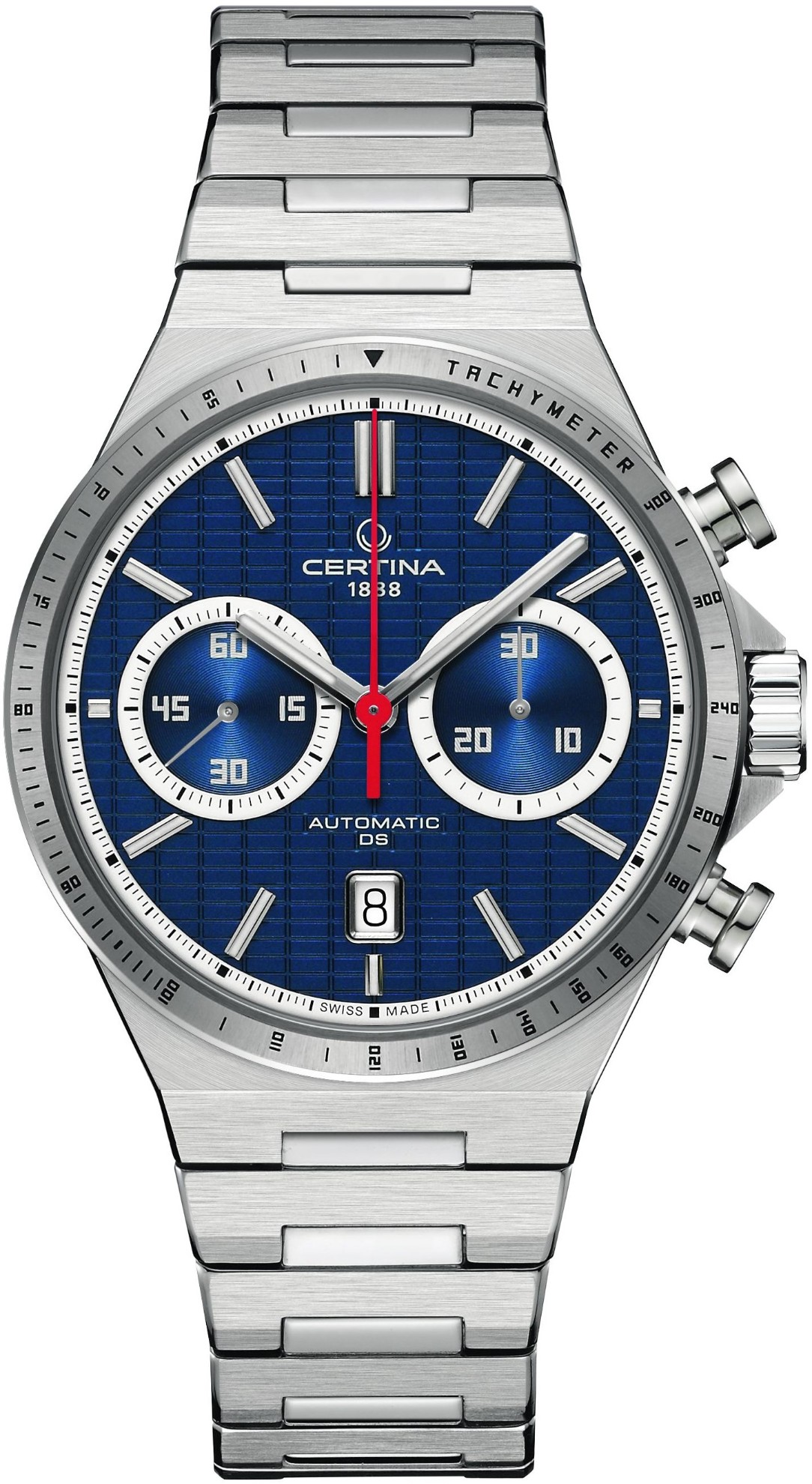 Certina DS-7 Chrono Auto C043.427.11.041.00 jsou pánské automatické hodinky na ocelovém náramku s motýlkovou sponou. Pouzdro z nerezové oceli má průměr 42 milimetrů, průhledné dýnko a lunetu s tachymetrickou stupnicí. Modrý strukturovaný číselník s chronografem a indikací data je chráněn odolným safírovým sklem s antireflexní vrstvou. Aplikované hodinové indexy jsou stejně jako ručky pokryty luminiscenčním nátěrem Super-LumiNova®, který garantuje perfektní čitelnost za zhoršených světelných podmínek. Pohon hodinek zajišťuje mechanický strojek ETA Valjoux A05.231 s automatickým nátahem a rezervou chodu přibližně 68 hodin. Kalibr je vybaven křemíkovým vláskem setrvačky, který hodinkám propůjčuje vysokou rezistenci vůči magnetickým polím. Tento strojek s funkcí hackingu lze v případě potřeby natahovat i ručně pomocí signované korunky. Model disponuje technologií DS (Double Security) používanou a zdokonalovanou již od roku 1959, díky které mají hodinky zvýšenou odolnost vůči nárazům a vodě. Vodotěsnost hodinek činí 10 ATM a jsou tedy vhodné pro koupání nebo šnorchlování.