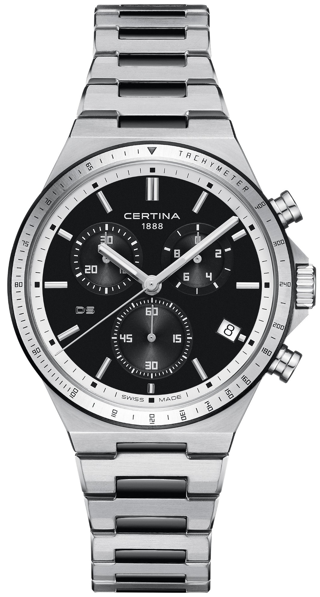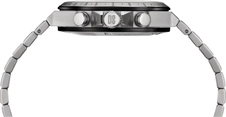 Certina DS-7 Chronograph C043.417.22.051.00 jsou pánské bateriové hodinky na kovovém integrovaném bicolor náramku s motýlkovou sponou. Pouzdro z nerezové oceli má průměr 41 milimetrů a pevnou lunetu s tachymetrickou stupnicí, kterou lze v kombinaci se stopkami využít pro měření rychlosti pohybujících se objektů. Na dýnku najdeme logo ve tvaru želvy, které reprezentuje robustnost a dlouhou životnost hodinek Certina. Černý číselník s indikací data a funkcí chronografu je chráněn odolným safírovým sklem s antireflexní vrstvou. Aplikované hodinové indexy jsou stejně jako ručky pokryty luminiscenčním nátěrem Super-LumiNova®, který garantuje perfektní čitelnost za zhoršených světelných podmínek. Pohon hodinek zajišťuje quartzový strojek ETA G10.212 s technologií Precidrive s přesností +/- 10 sekund za rok a indikací slabé baterie. Model disponuje technologií DS (Double Security) používanou a zdokonalovanou již od roku 1959, díky které mají hodinky zvýšenou odolnost vůči nárazům a vodě. Vodotěsnost hodinek činí 10 ATM a jsou tedy vhodné pro koupání nebo šnorchlování.