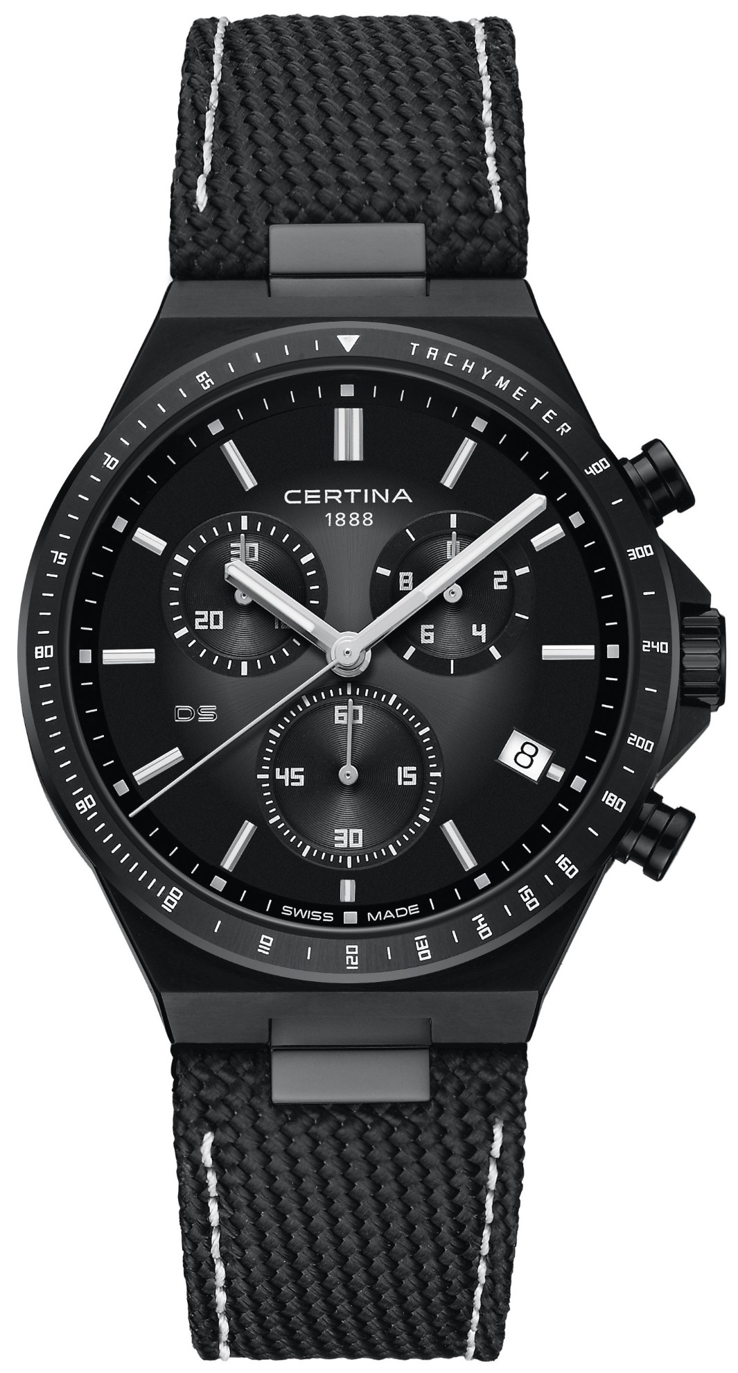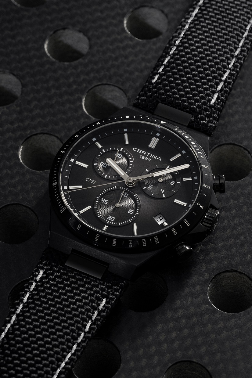 Certina DS-7 Chronograph C043.417.38.081.00 jsou pánské bateriové hodinky na textilním řemínku s bílým prošíváním a motýlkovou sponou. Pouzdro z nerezové oceli s černou povrchovou PVD úpravou má průměr 41 milimetrů a pevnou lunetu s tachymetrickou stupnicí, kterou lze v kombinaci se stopkami využít pro měření rychlosti pohybujících se objektů. Na dýnku najdeme logo ve tvaru želvy, které reprezentuje robustnost a dlouhou životnost hodinek Certina. Černý gradientní číselník s indikací data a funkcí chronografu je chráněn odolným safírovým sklem s antireflexní vrstvou. Aplikované hodinové indexy jsou stejně jako ručky pokryty luminiscenčním nátěrem Super-LumiNova®, který garantuje perfektní čitelnost za zhoršených světelných podmínek. Pohon hodinek zajišťuje quartzový strojek ETA G10.212 s technologií Precidrive s přesností +/- 10 sekund za rok a indikací slabé baterie. Model disponuje technologií DS (Double Security) používanou a zdokonalovanou již od roku 1959, díky které mají hodinky zvýšenou odolnost vůči nárazům a vodě. Vodotěsnost hodinek činí 10 ATM a jsou tedy vhodné pro koupání nebo šnorchlování.
