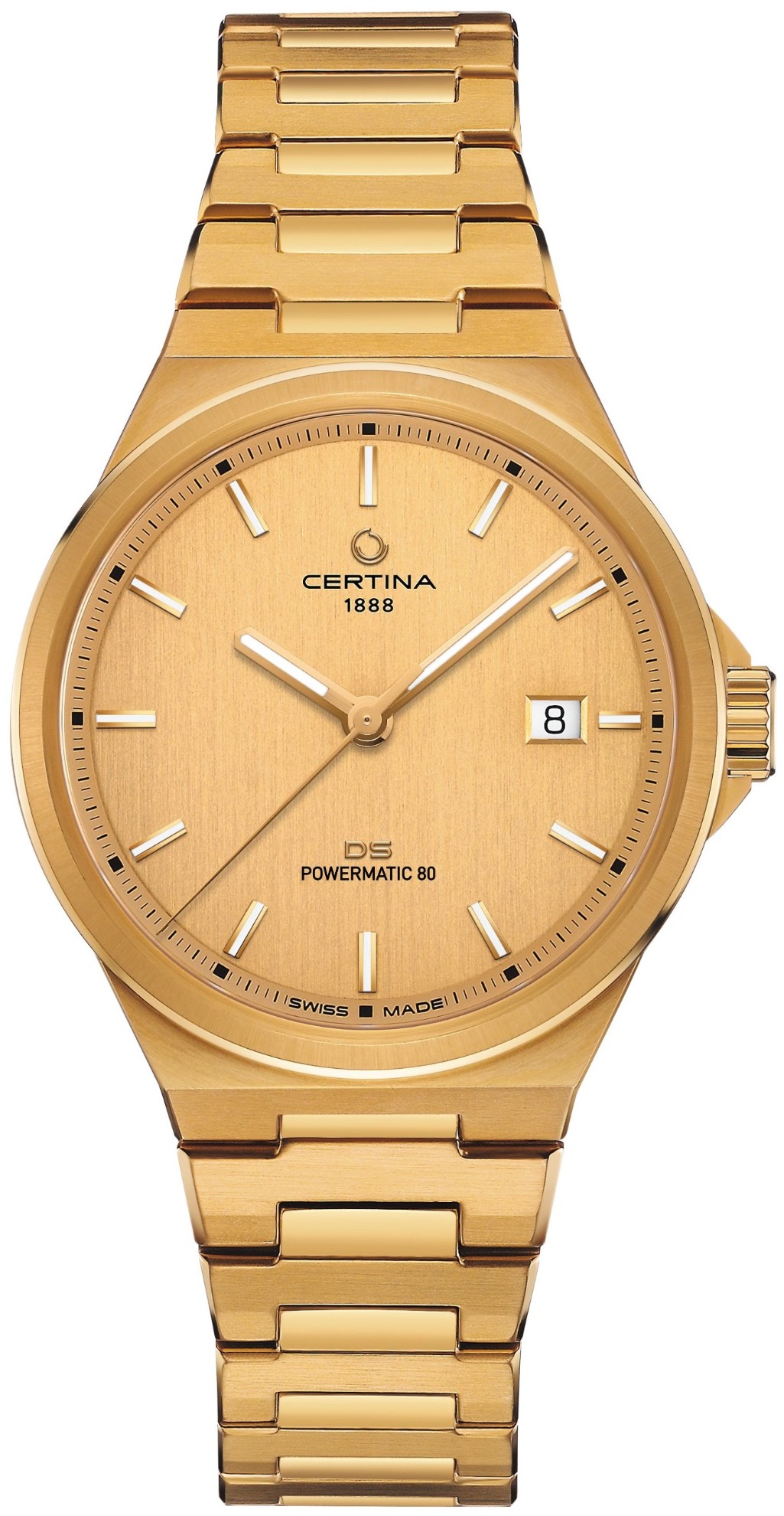 Certina DS-7 Powermatic 80 C043.407.33.361.00 jsou pánské automatické hodinky na kovovém integrovaném náramku s PVD úpravou zlaté barvy a motýlkovou sponou. Pouzdro z nerezové oceli ve stejné barvě má průměr 39 milimetrů a průhledné dýnko. Zlatý číselník s indikací data je chráněn odolným safírovým sklem s antireflexní vrstvou. Aplikované hodinové indexy i ručky ve zlaté barvě jsou pokryty luminiscenčním nátěrem Super-LumiNova®, který garantuje perfektní čitelnost za zhoršených světelných podmínek. Pohon hodinek zajišťuje mechanický strojek Powermatic 80.611 s automatickým nátahem a rezervou chodu přibližně 80 hodin, který je vybaven vláskem setrvačky Nivachron™, což je speciální antimagnetický materiál, díky kterému jsou hodinky velmi odolné vůči magnetickým polím. Tento strojek s funkcí hackingu lze v případě potřeby natahovat i ručně pomocí signované korunky. Model disponuje technologií DS (Double Security) používanou a zdokonalovanou již od roku 1959, díky které mají hodinky zvýšenou odolnost vůči nárazům a vodě. Vodotěsnost hodinek činí 10 ATM a jsou tedy vhodné pro koupání nebo šnorchlování.