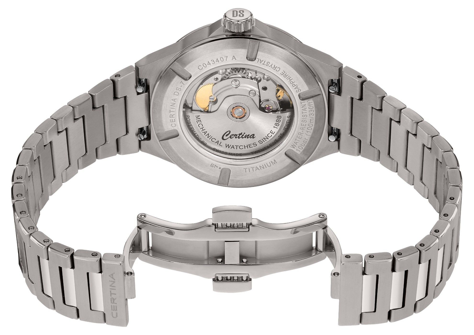 Certina DS-7 Powermatic 80 C043.407.44.041.00 jsou pánské automatické hodinky na titanovém integrovaném náramku v kombinaci brusu a lesku s motýlkovou sponou. Pouzdro z titanu má průměr 39 milimetrů a průhledné dýnko. Modrý číselník s efektem slunečního brusu a indikací data je chráněn odolným safírovým sklem s antireflexní vrstvou. Aplikované hodinové indexy jsou stejně jako ručky pokryty luminiscenčním nátěrem Super-LumiNova®, který garantuje perfektní čitelnost za zhoršených světelných podmínek. Pohon hodinek zajišťuje mechanický strojek Powermatic 80.611 s automatickým nátahem a rezervou chodu přibližně 80 hodin, který je vybaven vláskem setrvačky Nivachron™, což je speciální antimagnetický materiál, díky kterému jsou hodinky velmi odolné vůči magnetickým polím. Tento strojek s funkcí hackingu lze v případě potřeby natahovat i ručně pomocí signované korunky. Model disponuje technologií DS (Double Security) používanou a zdokonalovanou již od roku 1959, díky které mají hodinky zvýšenou odolnost vůči nárazům a vodě. Vodotěsnost hodinek činí 10 ATM a jsou tedy vhodné pro koupání nebo šnorchlování.