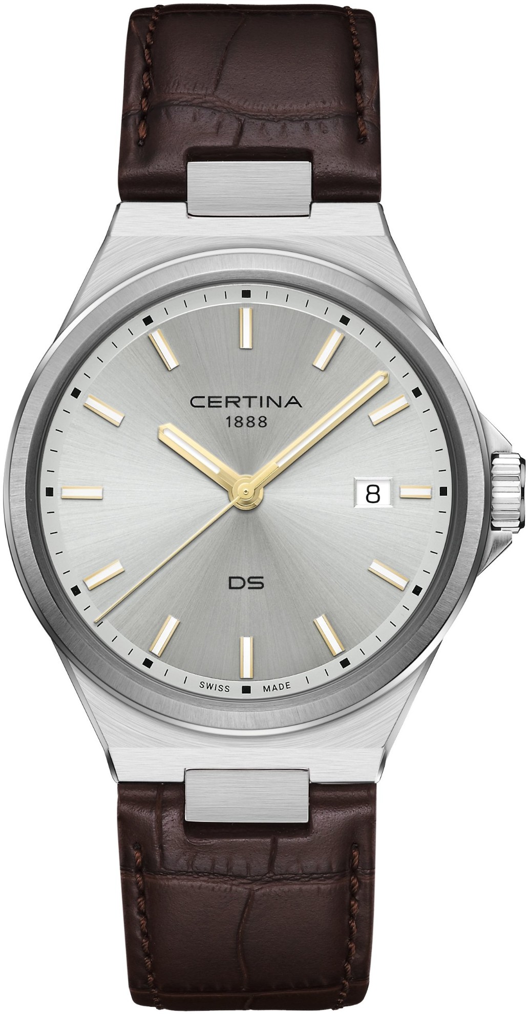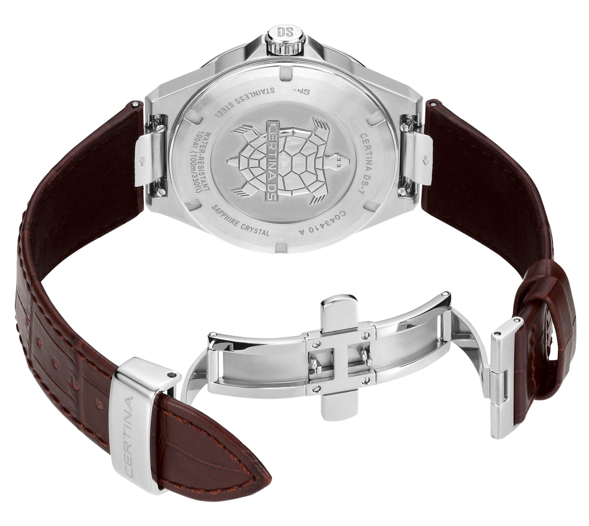 Certina DS-7 Quartz C043.410.16.031.00 jsou pánské bateriové elegantní hodinky na hnědém koženém řemínku s motýlkovou sponou. Pouzdro z nerezové oceli má průměr 39 milimetrů a zadní dýnko s logem ve tvaru želvy, které reprezentuje robustnost a dlouhou životnost hodinek Certina. Stříbrný číselník s efektem slunečního brusu a indikací data na třetí hodině je chráněn odolným safírovým sklem s antireflexní vrstvou. Aplikované hodinové indexy jsou stejně jako ručky pokryty luminiscenčním nátěrem Super-LumiNova®, který garantuje perfektní čitelnost za zhoršených světelných podmínek. Pohon hodinek zajišťuje quartzový strojek F06.412 s přesností +/- 10 sekund za rok a indikací slabé baterie. Model disponuje technologií DS (Double Security) používanou a zdokonalovanou již od roku 1959, díky které mají hodinky zvýšenou odolnost vůči nárazům a vodě. Vodotěsnost hodinek činí 10 ATM a jsou tedy vhodné pro koupání nebo šnorchlování.
