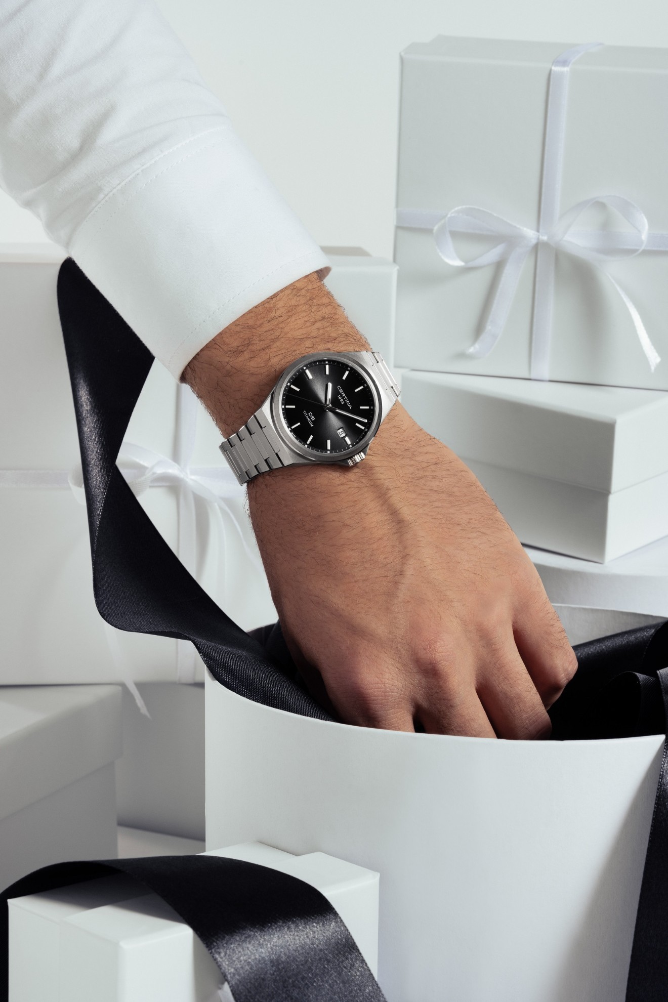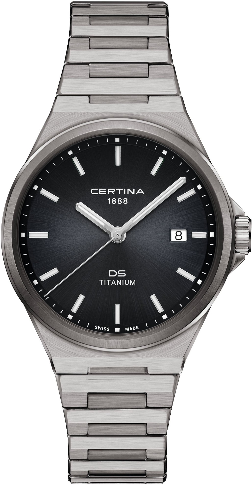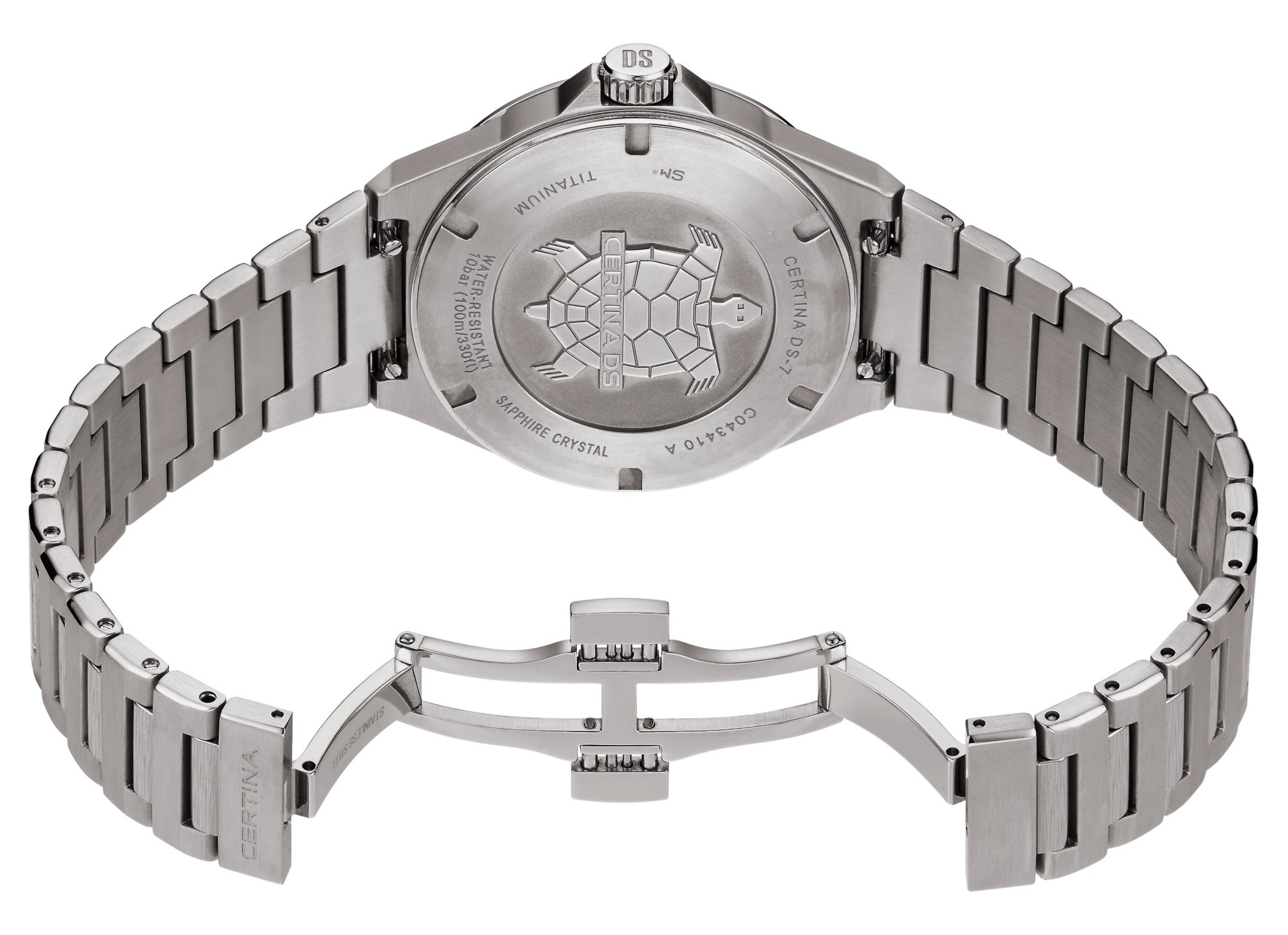 Certina DS-7 Quartz C043.410.44.051.00 jsou pánské bateriové hodinky na titanovém integrovaném náramku s motýlkovou sponou. Pouzdro z titanu má průměr 39 milimetrů a zadní dýnko s logem ve tvaru želvy, které reprezentuje robustnost a dlouhou životnost hodinek Certina. Černý gradientní číselník s efektem slunečního brusu a indikací data na třetí hodině je chráněn odolným safírovým sklem s antireflexní vrstvou. Aplikované hodinové indexy jsou stejně jako ručky pokryty luminiscenčním nátěrem Super-LumiNova®, který garantuje perfektní čitelnost za zhoršených světelných podmínek. Pohon hodinek zajišťuje quartzový strojek F06.412 s přesností +/- 10 sekund za rok a indikací slabé baterie. Model disponuje technologií DS (Double Security) používanou a zdokonalovanou již od roku 1959, díky které mají hodinky zvýšenou odolnost vůči nárazům a vodě. Vodotěsnost hodinek činí 10 ATM a jsou tedy vhodné pro koupání nebo šnorchlování.
