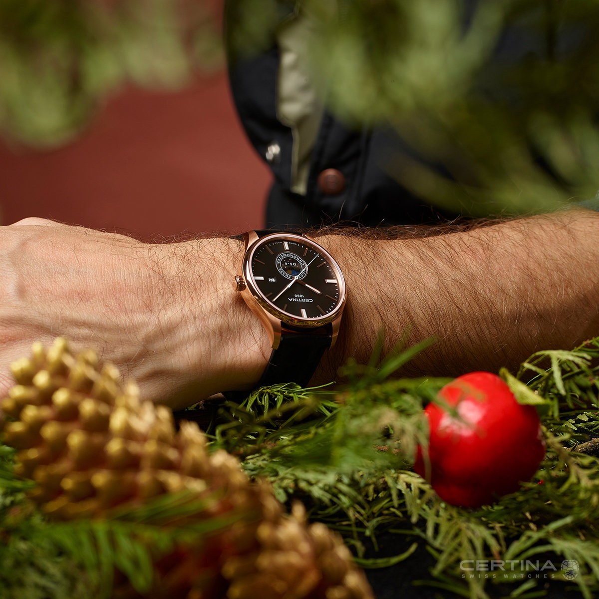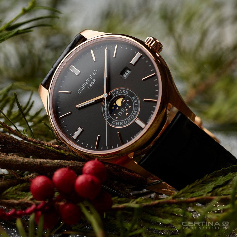Certina DS-8 C033.457.36.051.00 jsou pánské bateriové hodinky na koženém řemínku s motýlkovou sponou. Pouzdro z nerezové oceli s PVD úpravou v barvě růžového zlata má průměr 40 milimetrů a dýnko značené logem ve tvaru želvy, které reprezentuje robustnost a dlouhou životnost hodinek Certina. Černý číselník s ukazatelem měsíční fáze a datumovkou je chráněn odolným safírovým sklem s antireflexní vrstvou. Aplikované hodinové indexy jsou spolu s ručkami pokryté luminiscenčním nátěrem Super-LumiNova®, který garantuje perfektní čitelnost za zhoršených světelných podmínek. Pohon hodinek zajišťuje quartzový strojek ETA F05.441 s technologií Precidrive s přesností +/- 10 sekund za rok a indikací slabé baterie. Hodinky s C.O.S.C. certifikací, která je zárukou vysoké přesnosti, nesou označení „Chronometer“. Model disponuje technologií DS (Double Security) používanou a zdokonalovanou již od roku 1959, díky které mají hodinky zvýšenou odolnost vůči nárazům a vodě. Vodotěsnost hodinek činí 10 ATM a jsou tedy vhodné pro koupání nebo šnorchlování.
