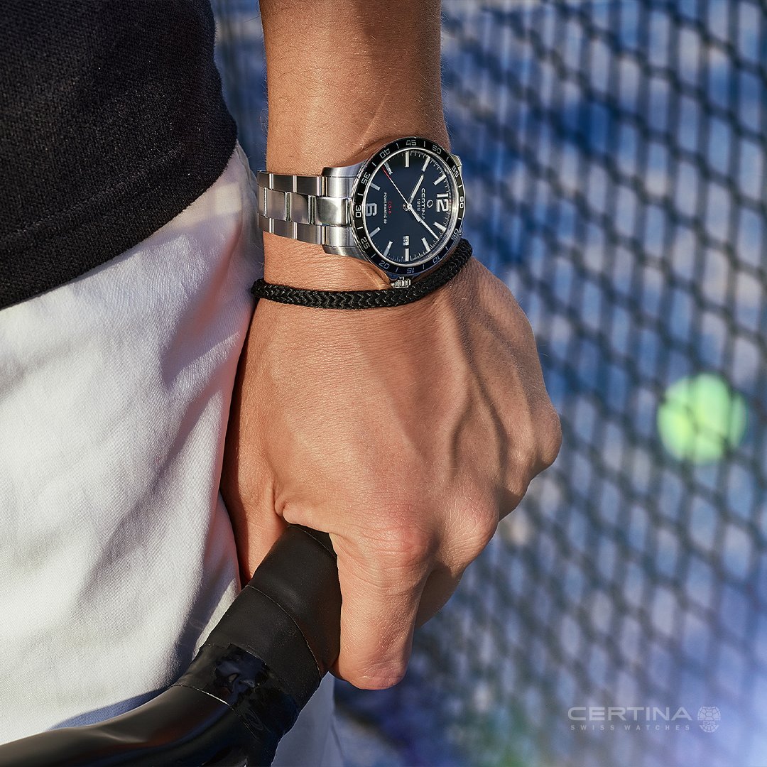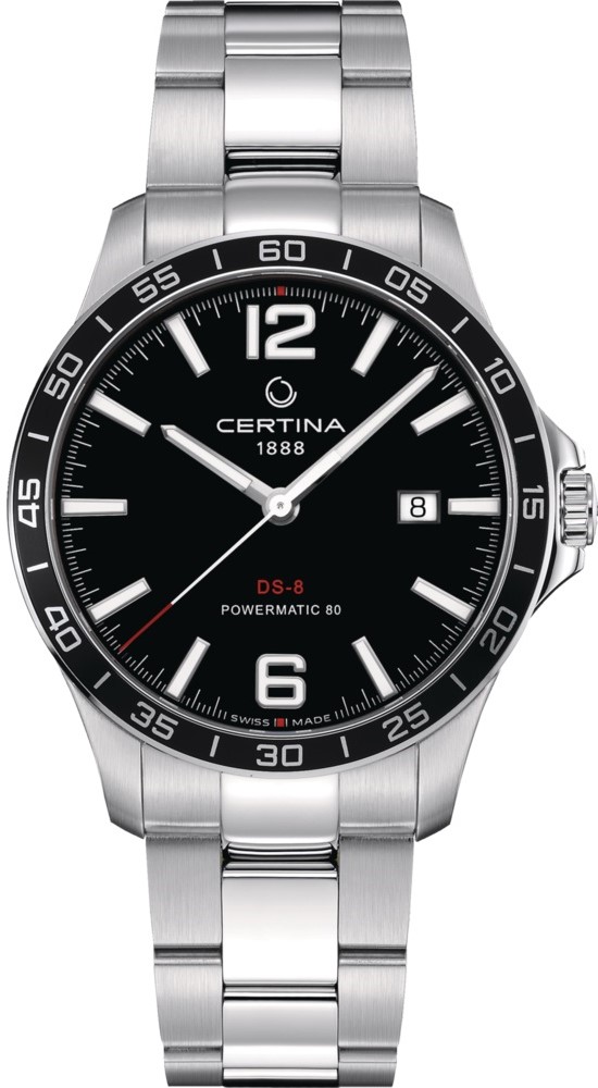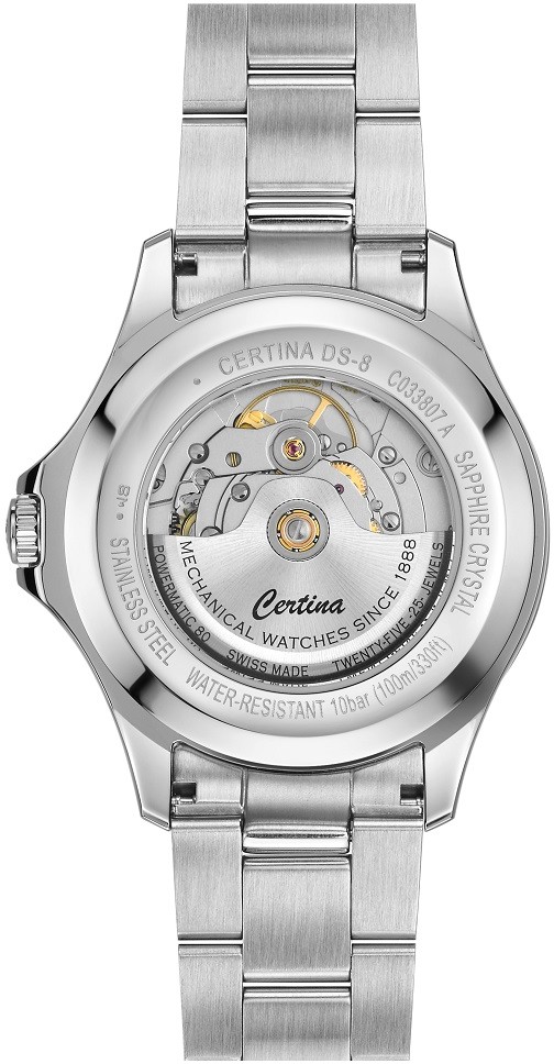 Certina DS-8 C033.807.11.057.00 jsou pánské automatické hodinky na kovovém náramku v kombinaci brusu a lesku s motýlkovou sponou. Ocelové pouzdro má průměr 40,5 milimetru, průhledné dýnko a pevnou lunetu s černou hliníkovou vložkou s minutovou stupnicí. Černý číselník s indikací data je chráněn odolným safírovým sklem s antireflexní vrstvou. Aplikované hodinové indexy jsou spolu s ručkami pokryty luminiscenčním nátěrem Super-LumiNova®, který garantuje perfektní čitelnost za zhoršených světelných podmínek. Pohon hodinek zajišťuje mechanický strojek Powermatic 80.611 s automatickým nátahem a rezervou chodu přibližně 80 hodin. Powermatic je vybaven vláskem setrvačky Nivachron™, což je speciální antimagnetický materiál, díky kterému jsou hodinky velmi odolné vůči magnetickým polím. Tento strojek s funkcí hackingu lze v případě potřeby natahovat i ručně pomocí signované korunky. Model disponuje technologií DS (Double Security) používanou a zdokonalovanou již od roku 1959, díky které mají hodinky zvýšenou odolnost vůči nárazům a vodě. Vodotěsnost hodinek činí 10 ATM a jsou tedy vhodné pro koupání nebo šnorchlování.