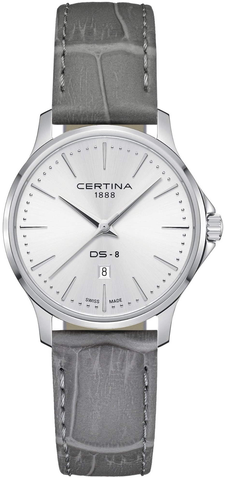 Certina DS-8 C045.010.16.031.00 jsou dámské elegantní bateriové hodinky na šedém koženém řemínku s trnovou sponou. Pouzdro z nerezové oceli má průměr 31 milimetrů a dýnko značené logem ve tvaru želvy, které reprezentuje robustnost a dlouhou životnost hodinek Certina. Stříbrný číselník s efektem slunečního brusu a indikací data je chráněn odolným safírovým sklem s antireflexní vrstvou. Pohon hodinek zajišťuje quartzový strojek ETA F03.412 s technologií Precidrive s přesností +/- 10 sekund za rok a indikací slabé baterie. Model disponuje technologií DS (Double Security) používanou a zdokonalovanou již od roku 1959, díky které mají hodinky zvýšenou odolnost vůči nárazům a vodě. Vodotěsnost hodinek činí 10 ATM a jsou tedy vhodné pro koupání nebo šnorchlování.