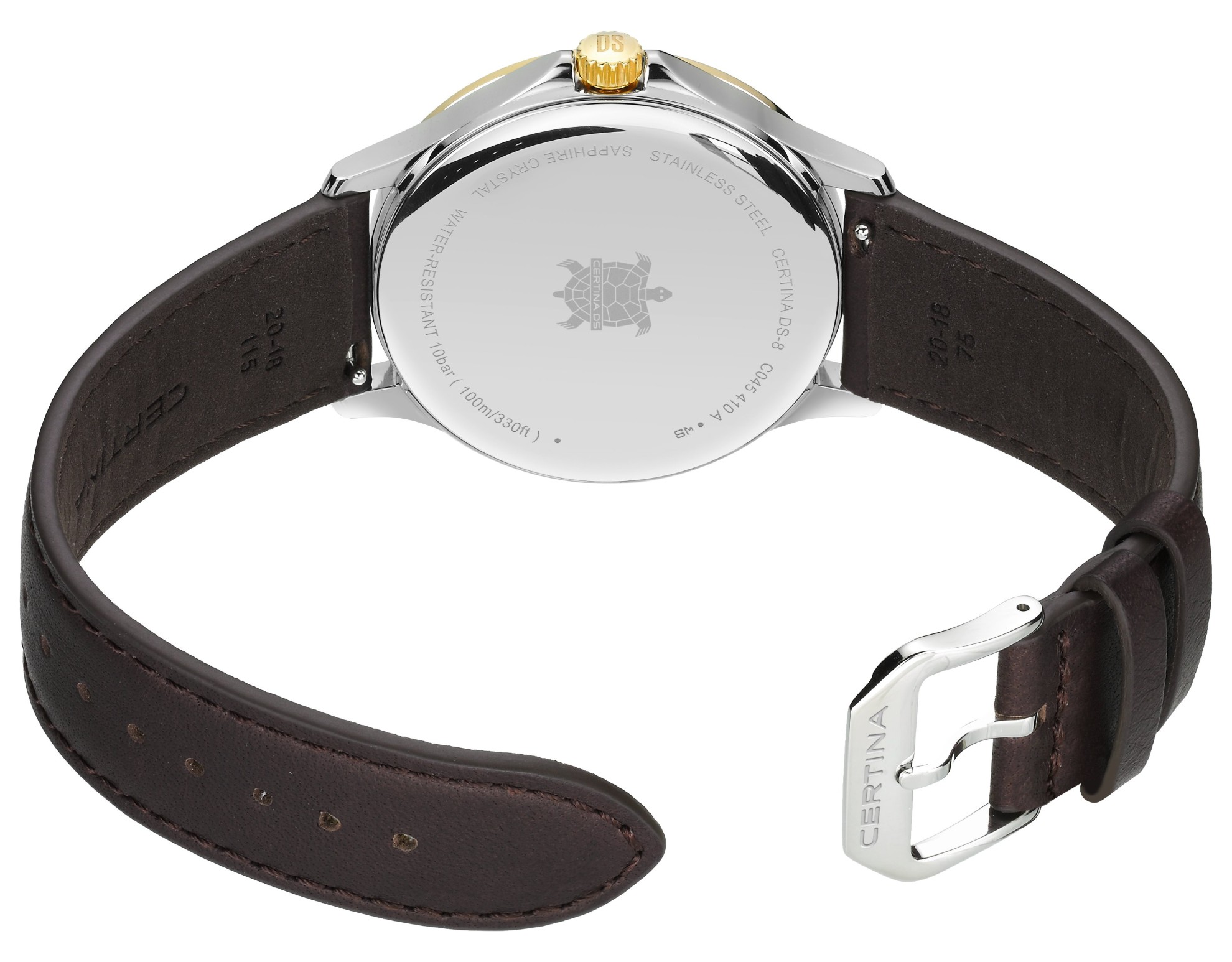 Certina DS-8 C045.410.26.031.00 jsou pánské elegantní bateriové hodinky na hnědém koženém řemínku s trnovou sponou. Pouzdro z nerezové oceli má průměr 40 milimetrů, lunetu a korunku opatřenou PVD úpravou zlaté barvy a dýnko značené logem ve tvaru želvy, které reprezentuje robustnost a dlouhou životnost hodinek Certina. Bílý číselník s indikací data na šesté hodině je chráněn odolným safírovým sklem s antireflexní vrstvou. Pohon hodinek zajišťuje quartzový strojek ETA F05.412 s technologií Precidrive s přesností +/- 10 sekund za rok a indikací slabé baterie. Model disponuje technologií DS (Double Security) používanou a zdokonalovanou již od roku 1959, díky které mají hodinky zvýšenou odolnost vůči nárazům a vodě. Vodotěsnost hodinek činí 10 ATM a jsou tedy vhodné pro koupání nebo šnorchlování.