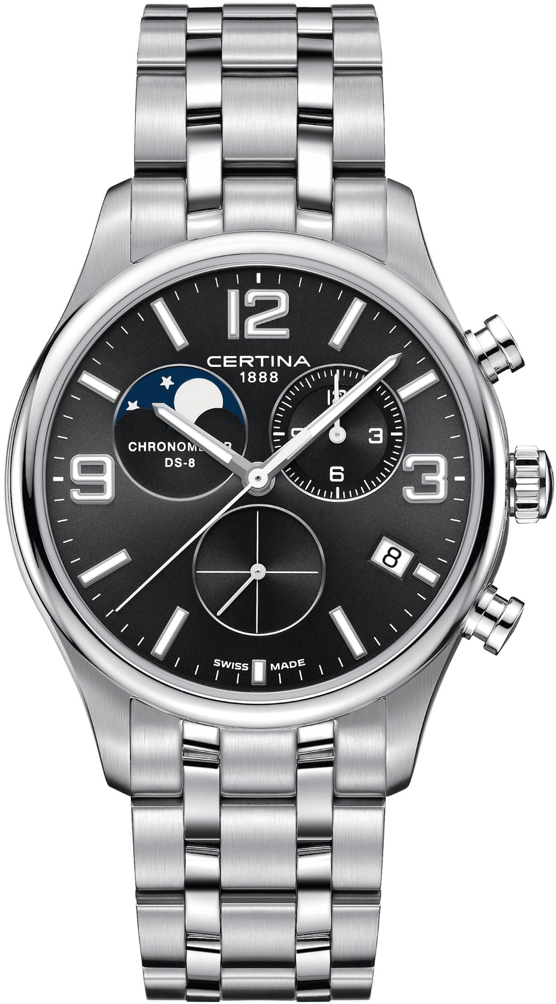 Certina DS-8 Chronograph Moonphase C033.460.11.057.00 jsou pánské bateriové hodinky na kovovém náramku v kombinaci brusu a lesku s motýlkovou sponou. Pouzdro z nerezové oceli má průměr 42 milimetrů a dýnko značené logem ve tvaru želvy, které reprezentuje robustnost a dlouhou životnost hodinek Certina. Černý číselník s efektem slunečního brusu, datumovkou, ukazatelem měsíční fáze a funkcí chronografu je chráněn odolným safírovým sklem s antireflexní vrstvou. Aplikované hodinové indexy jsou spolu s ručkami pokryty luminiscenčním nátěrem Super-LumiNova®, který garantuje perfektní čitelnost za zhoršených světelných podmínek. Pohon hodinek zajišťuje quartzový strojek ETA G10.962 s technologií Precidrive s přesností +/- 10 sekund za rok a indikací slabé baterie. Hodinky s C.O.S.C. certifikací, která je zárukou vysoké přesnosti, nesou označení „Chronometer“. Model disponuje technologií DS (Double Security) používanou a zdokonalovanou již od roku 1959, díky které mají hodinky zvýšenou odolnost vůči nárazům a vodě. Vodotěsnost hodinek činí 10 ATM a jsou tedy vhodné pro koupání nebo šnorchlování.