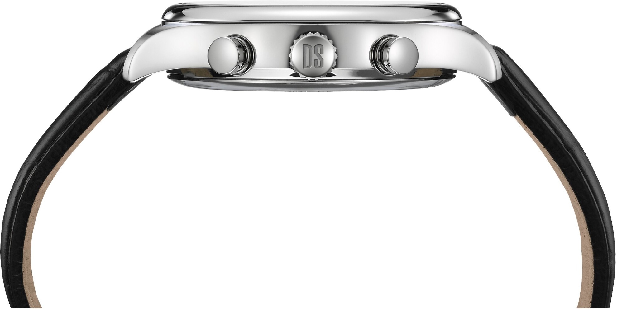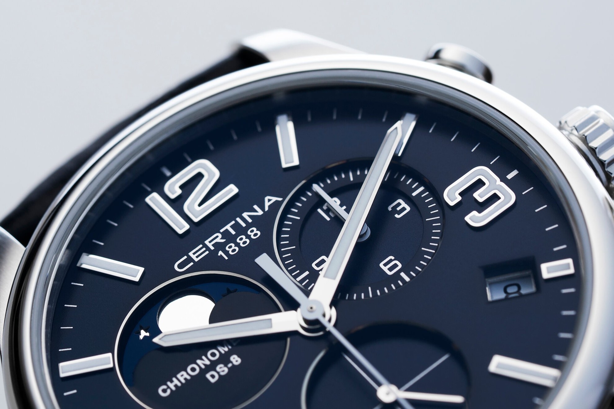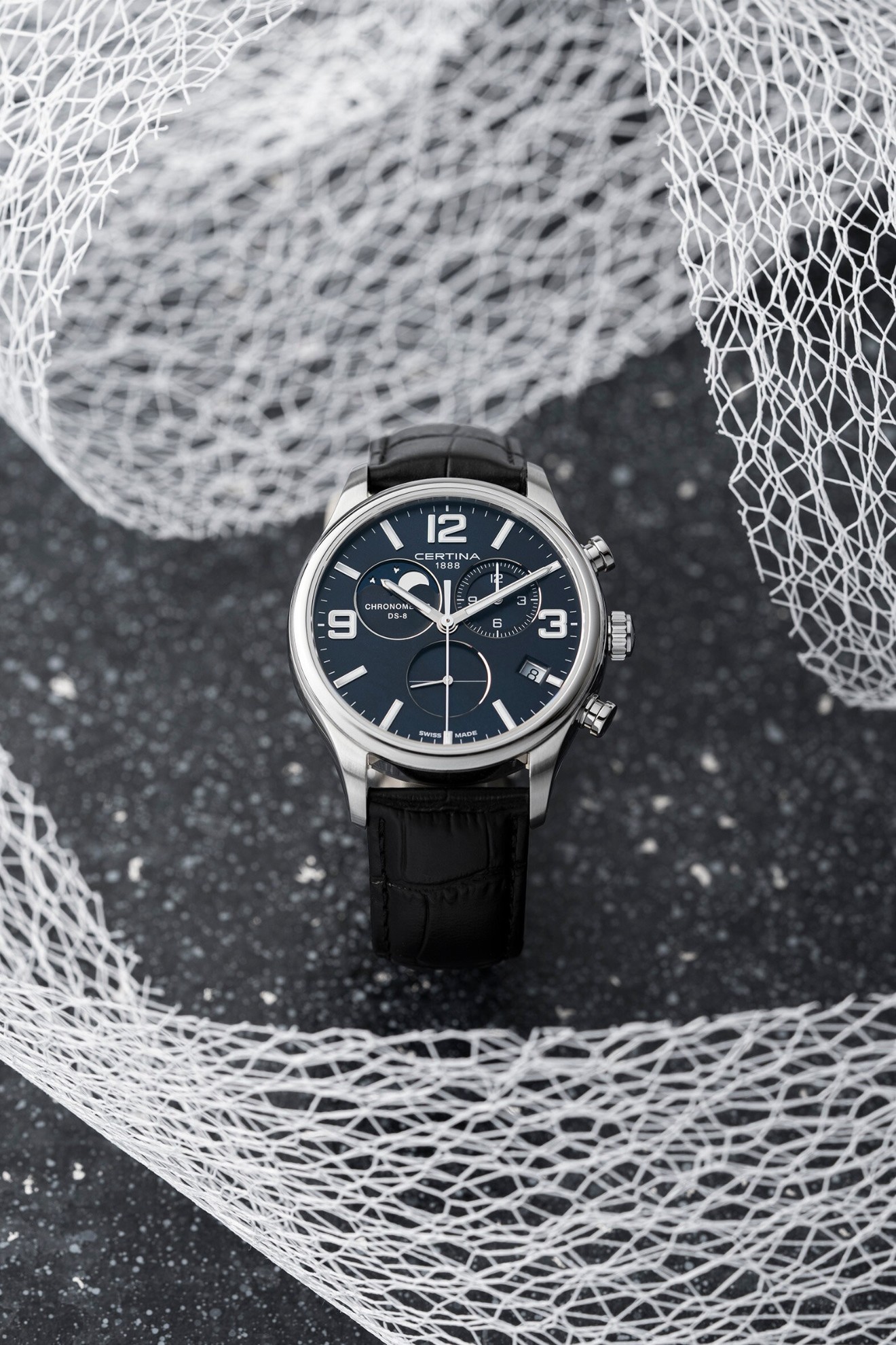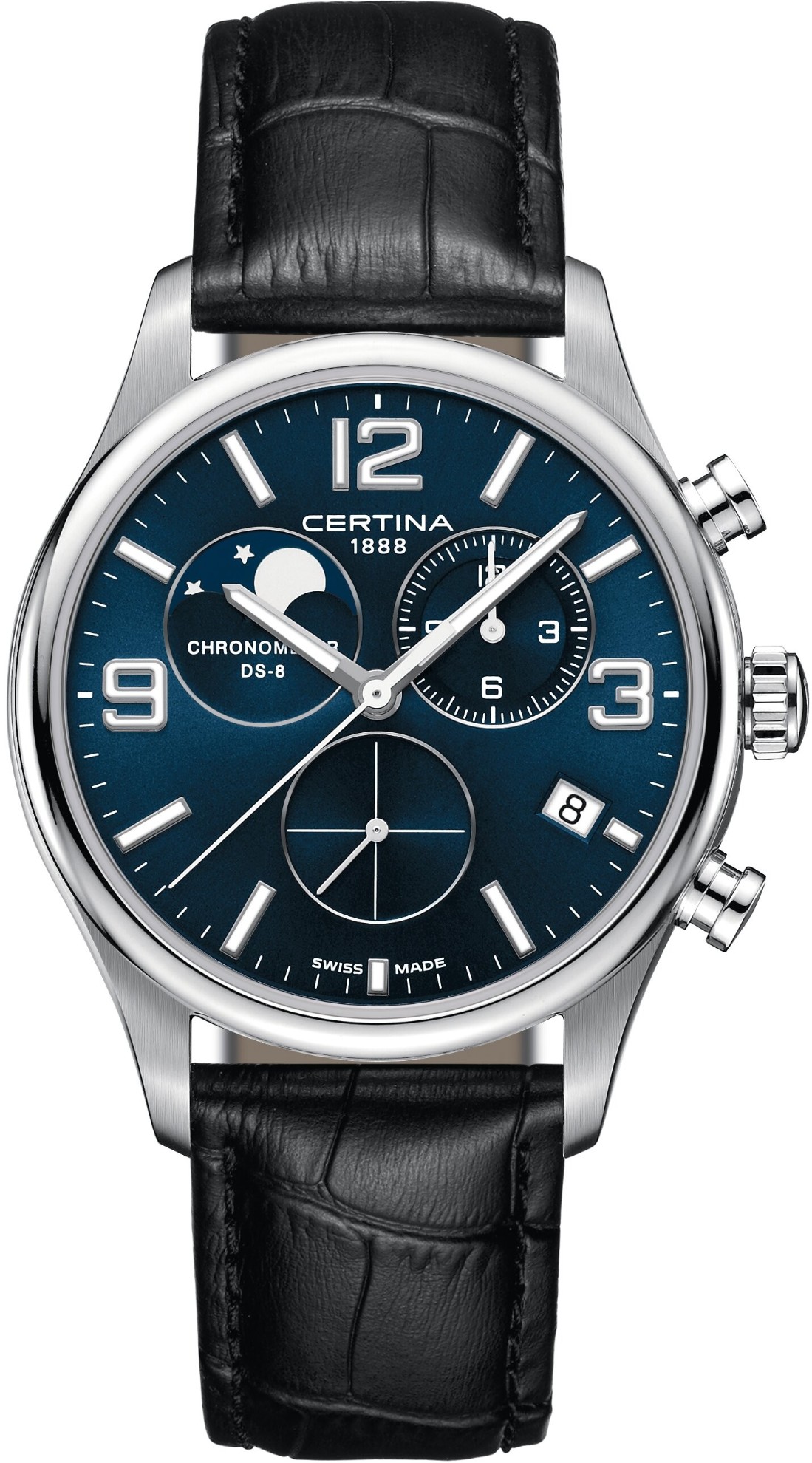 Certina DS-8 Chronograph Moonphase C033.460.16.047.00 jsou pánské bateriové hodinky na černém koženém řemínku s motýlkovou sponou. Pouzdro z nerezové oceli má průměr 42 milimetrů a dýnko značené logem ve tvaru želvy, které reprezentuje robustnost a dlouhou životnost hodinek Certina. Tmavě modrý číselník s efektem slunečního brusu, datumovkou, ukazatelem měsíční fáze a funkcí chronografu je chráněn odolným safírovým sklem s antireflexní vrstvou. Aplikované hodinové indexy jsou spolu s ručkami pokryty luminiscenčním nátěrem Super-LumiNova®, který garantuje perfektní čitelnost za zhoršených světelných podmínek. Pohon hodinek zajišťuje quartzový strojek ETA G10.962 s technologií Precidrive s přesností +/- 10 sekund za rok a indikací slabé baterie. Hodinky s C.O.S.C. certifikací, která je zárukou vysoké přesnosti, nesou označení „Chronometer“. Model disponuje technologií DS (Double Security) používanou a zdokonalovanou již od roku 1959, díky které mají hodinky zvýšenou odolnost vůči nárazům a vodě. Vodotěsnost hodinek činí 10 ATM a jsou tedy vhodné pro koupání nebo šnorchlování.