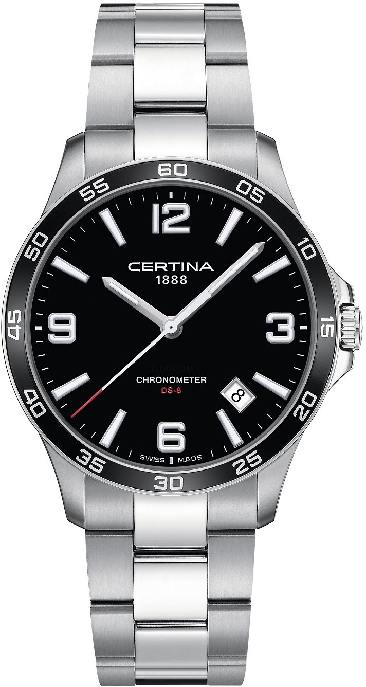 Certina DS-8 Quartz Precidrive Chronometer C033.851.11.057.00 jsou pánské bateriové hodinky na kovovém náramku v kombinaci brusu a lesku s motýlkovou sponou. Pouzdro z nerezové oceli doplněné pevnou lunetou s černou hliníkovou vložkou s minutovou stupnicí má průměr 41 milimetrů a dýnko značené logem ve tvaru želvy, které reprezentuje robustnost a dlouhou životnost hodinek Certina. Černý číselník s indikací data je chráněn odolným safírovým sklem s antireflexní vrstvou. Aplikované hodinové indexy jsou spolu s ručkami pokryty luminiscenčním nátěrem Super-LumiNova®, který garantuje perfektní čitelnost za zhoršených světelných podmínek. Pohon hodinek zajišťuje quartzový strojek ETA F07.412 s technologií Precidrive s přesností +/- 10 sekund za rok a indikací slabé baterie. Hodinky s C.O.S.C. certifikací, která je zárukou vysoké přesnosti, nesou označení „Chronometer“. Model disponuje technologií DS (Double Security) používanou a zdokonalovanou již od roku 1959, díky které mají hodinky zvýšenou odolnost vůči nárazům a vodě. Vodotěsnost hodinek činí 10 ATM a jsou tedy vhodné pro koupání nebo šnorchlování.