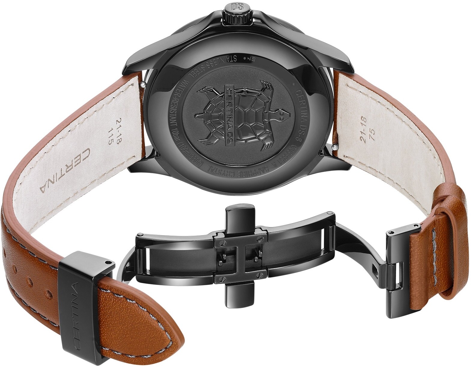 Certina DS-8 Quartz Precidrive Chronometer C033.851.36.057.00 jsou pánské bateriové hodinky na hnědém koženém řemínku s motýlkovou sponou. Pouzdro z nerezové oceli s černou PVD úpravou má průměr 41 milimetrů, pevnou lunetu s černou hliníkovou vložkou s minutovou stupnicí a dýnko značené logem ve tvaru želvy, které reprezentuje robustnost a dlouhou životnost hodinek Certina. Černý číselník s indikací data je chráněn odolným safírovým sklem s antireflexní vrstvou. Aplikované hodinové indexy jsou spolu s ručkami pokryty luminiscenčním nátěrem Super-LumiNova®, který garantuje perfektní čitelnost za zhoršených světelných podmínek. Pohon hodinek zajišťuje quartzový strojek ETA F07.412 s technologií Precidrive s přesností +/- 10 sekund za rok a indikací slabé baterie. Hodinky s C.O.S.C. certifikací, která je zárukou vysoké přesnosti, nesou označení „Chronometer“. Model disponuje technologií DS (Double Security) používanou a zdokonalovanou již od roku 1959, díky které mají hodinky zvýšenou odolnost vůči nárazům a vodě. Vodotěsnost hodinek činí 10 ATM a jsou tedy vhodné pro koupání nebo šnorchlování.