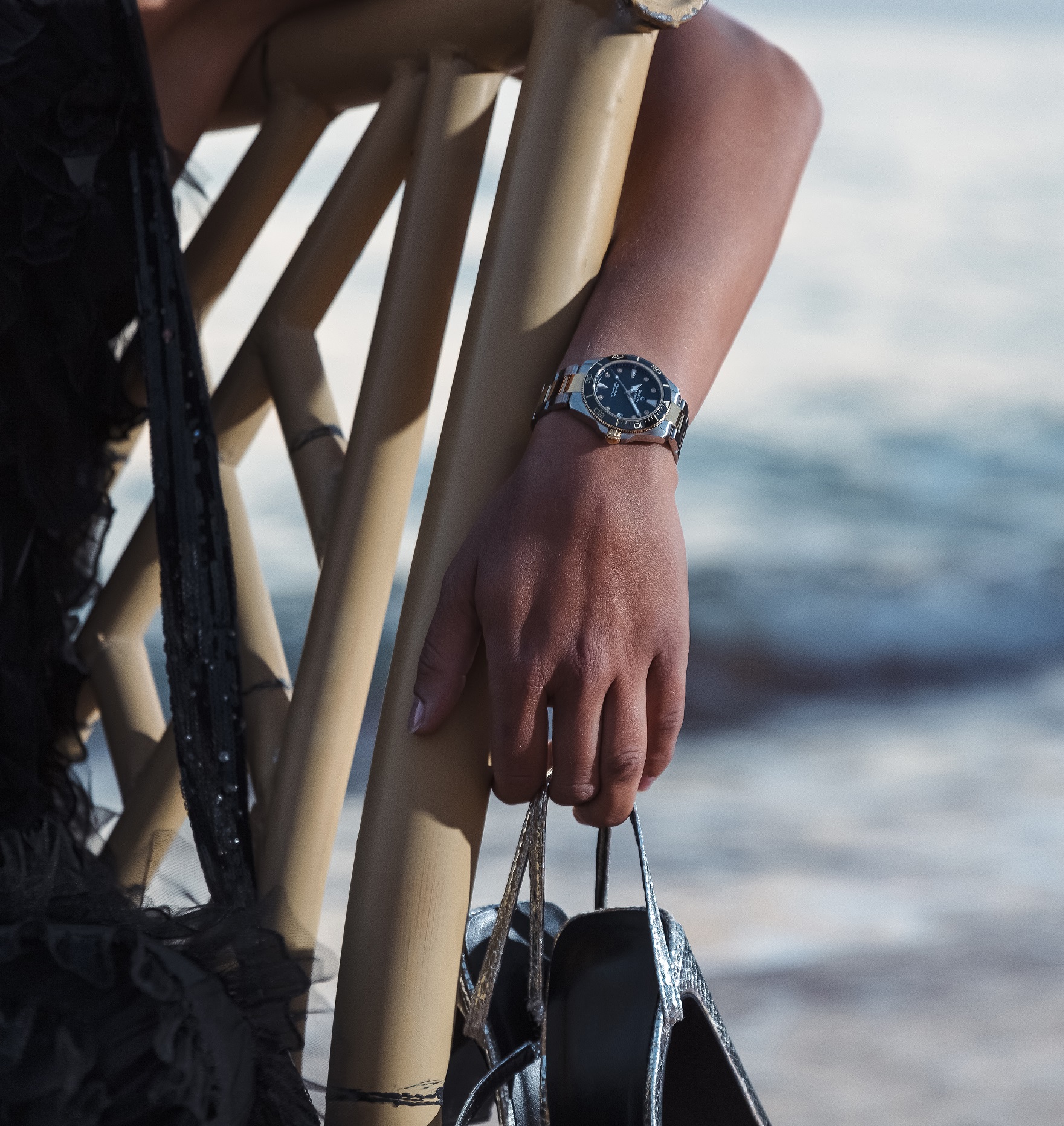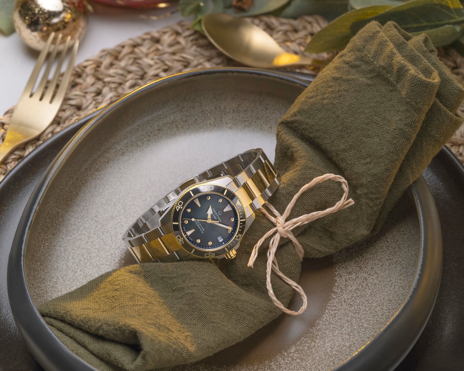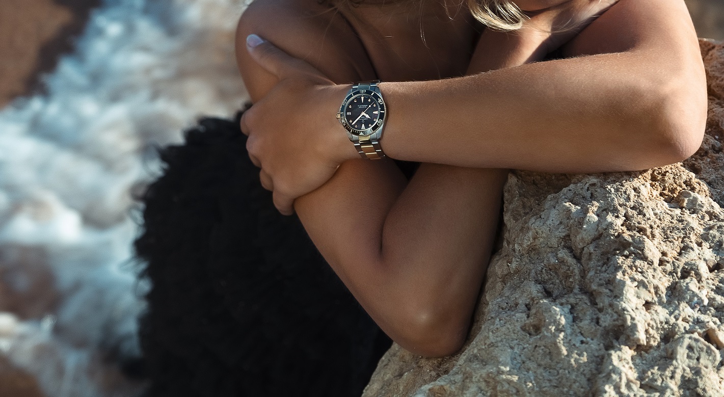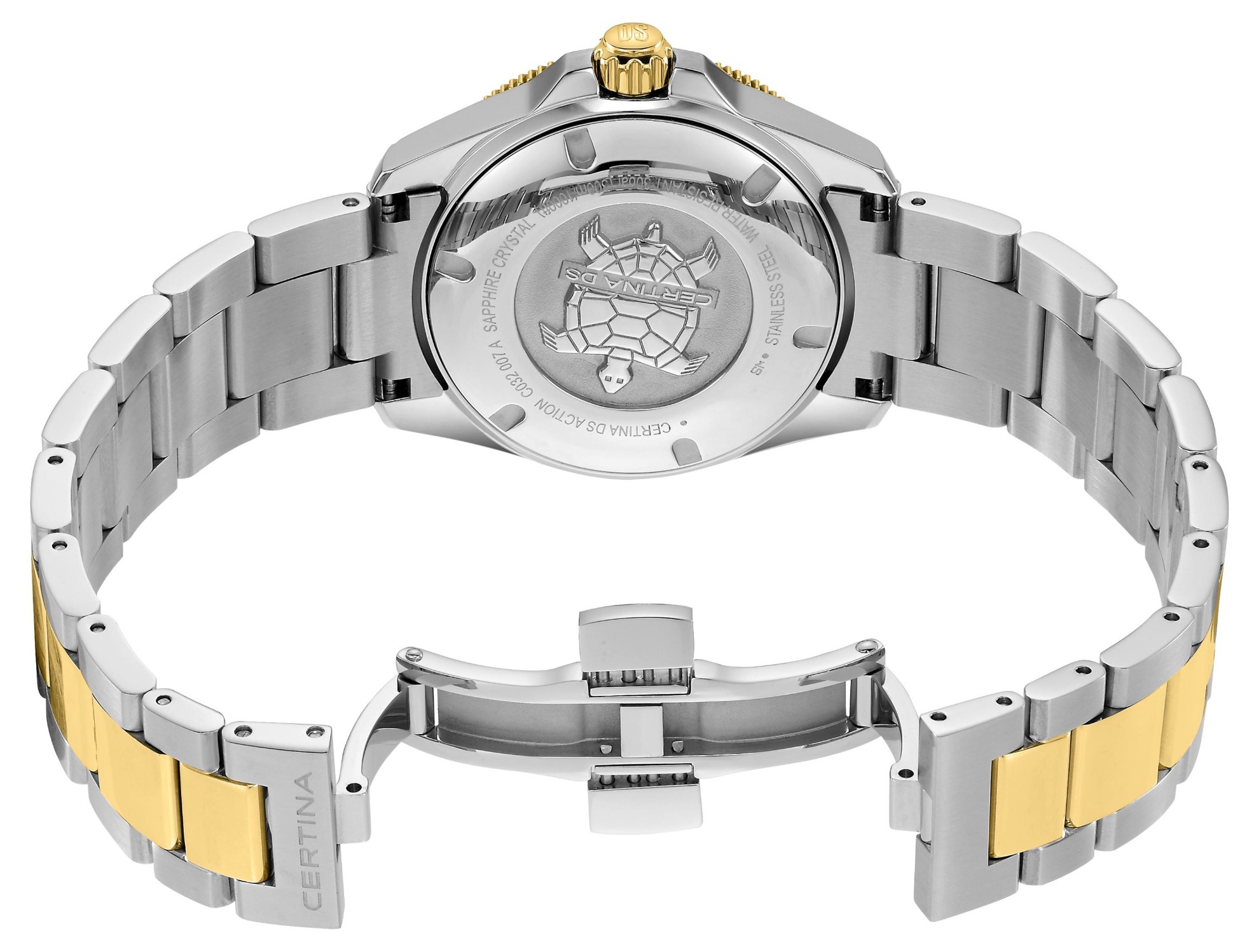 Certina DS Action Lady C032.007.22.126.00 jsou dámské automatické hodinky na kovovém bicolor náramku s motýlkovou sponou. Pouzdro z nerezové oceli má průměr 34,5 milimetru a dýnko značené logem ve tvaru želvy, které reprezentuje robustnost a dlouhou životnost hodinek Certina. Hodinky jsou vybaveny jednosměrně otočnou lunetou ve zlaté povrchové PVD úpravě s keramickou vložkou s potápěčskou stupnicí. Perleťový číselník s 8 diamanty a indikací data je chráněn odolným safírovým sklem s antireflexní vrstvou a jeho krása vyniká zejména pod přímým světlem, kdy můžeme pozorovat hru barev perleti. Aplikované hodinové indexy i ručky ve zlaté barvě jsou pokryty luminiscenčním nátěrem Super-LumiNova®, který garantuje perfektní čitelnost za zhoršených světelných podmínek. Pohon hodinek zajišťuje mechanický strojek Powermatic 80.611 s automatickým nátahem a rezervou chodu přibližně 80 hodin. Kalibr je vybaven vláskem setrvačky Nivachron, což je speciální antimagnetický materiál, díky kterému jsou hodinky velmi odolné vůči magnetickým polím. Tento strojek s funkcí hackingu lze v případě potřeby natahovat i ručně pomocí šroubovací korunky. Model disponuje technologií DS (Double Security) používanou a zdokonalovanou již od roku 1959, díky které mají hodinky zvýšenou odolnost vůči nárazům a vodě. Vodotěsnost hodinek činí 30 ATM a s certifikací ISO 6425 jsou vhodnou volbou pro přístrojové potápění.