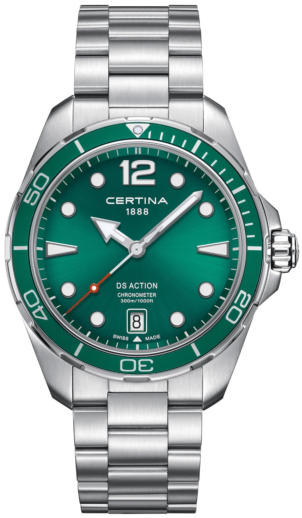 Certina DS Action C032.451.11.097.00 jsou pánské bateriové hodinky na ocelovém náramku s překlápěcí sponou. Pouzdro z nerezové oceli v kombinaci brusu a lesku má průměr 43 milimetrů, šroubovací korunku, jednosměrně otočnou lunetu s hliníkovou vložkou s potápěčskou stupnicí a dýnko značené logem ve tvaru želvy, které reprezentuje robustnost a dlouhou životnost hodinek Certina. Zelený číselník s efektem slunečního brusu a indikací data je chráněn odolným safírovým sklem s antireflexní vrstvou. Aplikované hodinové indexy jsou s ručkami pokryty luminiscenčním nátěrem Super-LumiNova®, který garantuje perfektní čitelnost za zhoršených světelných podmínek. Pohon hodinek zajišťuje spolehlivý quartzový strojek ETA F07.412 s technologií Precidrive s přesností +/- 10 sekund za rok a indikací slabé baterie. Hodinky s C.O.S.C. certifikací, která je zárukou vysoké přesnosti, nesou označení „Chronometer“. Model disponuje technologií DS (Double Security) používanou a zdokonalovanou již od roku 1959, díky které mají hodinky zvýšenou odolnost vůči nárazům a vodě. Vodotěsnost hodinek činí 30 ATM a jsou tak vhodnou volbou pro šnorchlování a hlubinné potápění.