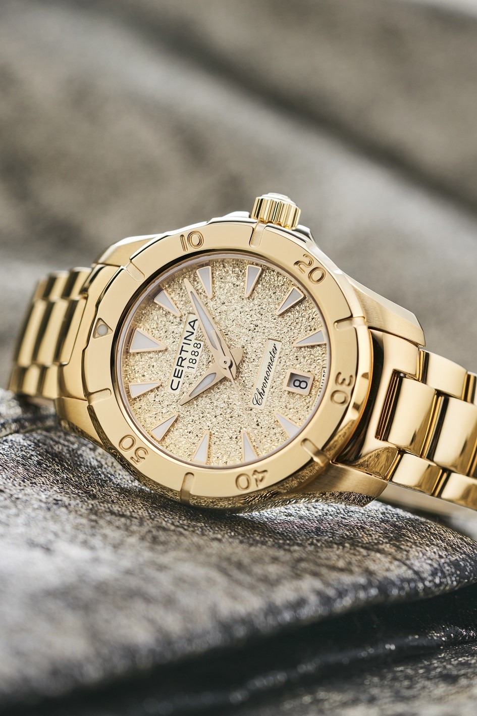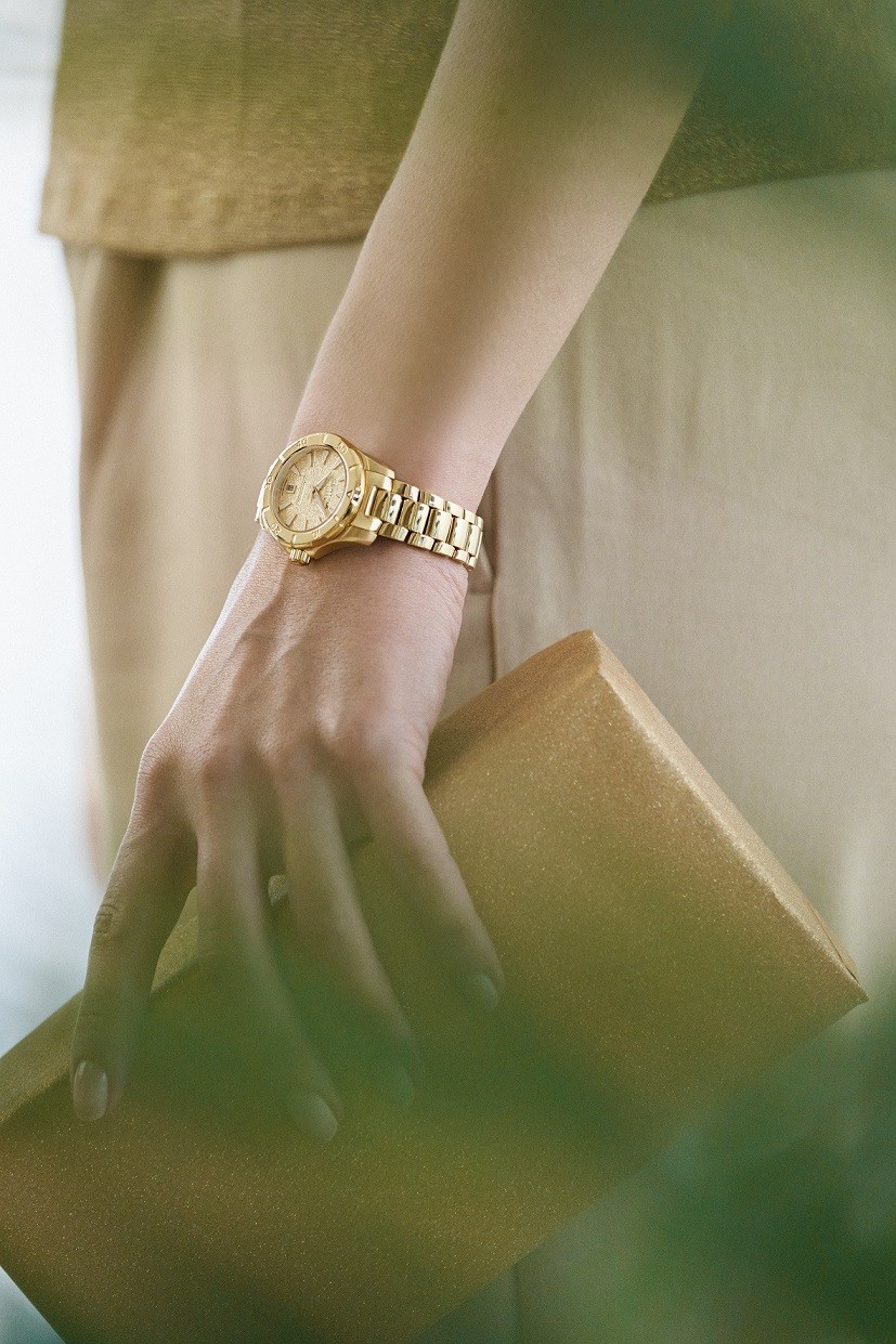 Certina Aqua DS Action C032.951.33.361.00 jsou dámské bateriové hodinky na kovovém náramku s PVD úpravou zlaté barvy a motýlkovou sponou. Pouzdro z nerezové oceli ve stejné barvě jako náramek má průměr 29 milimetrů, šroubovací korunku a jednosměrně otočnou lunetu s potápěčskou stupnicí. Dýnko značené logem ve tvaru želvy reprezentuje robustnost a dlouhou životnost hodinek Certina. Zlatý texturovaný číselník s indikací data je chráněn odolným safírovým sklem s antireflexní vrstvou. Aplikované hodinové indexy jsou spolu s ručkami pokryty luminiscenčním nátěrem Super-LumiNova®, který garantuje perfektní čitelnost za zhoršených světelných podmínek. Pohon hodinek zajišťuje spolehlivý quartzový strojek ETA F04.412 s technologií Precidrive s přesností +/- 10 sekund za rok a indikací slabé baterie. Hodinky s C.O.S.C. certifikací, která je zárukou vysoké přesnosti, nesou označení „Chronometer“. Model disponuje technologií DS (Double Security) používanou a zdokonalovanou již od roku 1959, díky které mají hodinky zvýšenou odolnost vůči nárazům a vodě. Vodotěsnost hodinek činí 20 ATM a jsou tak vhodnou volbou pro šnorchlování a potápění.