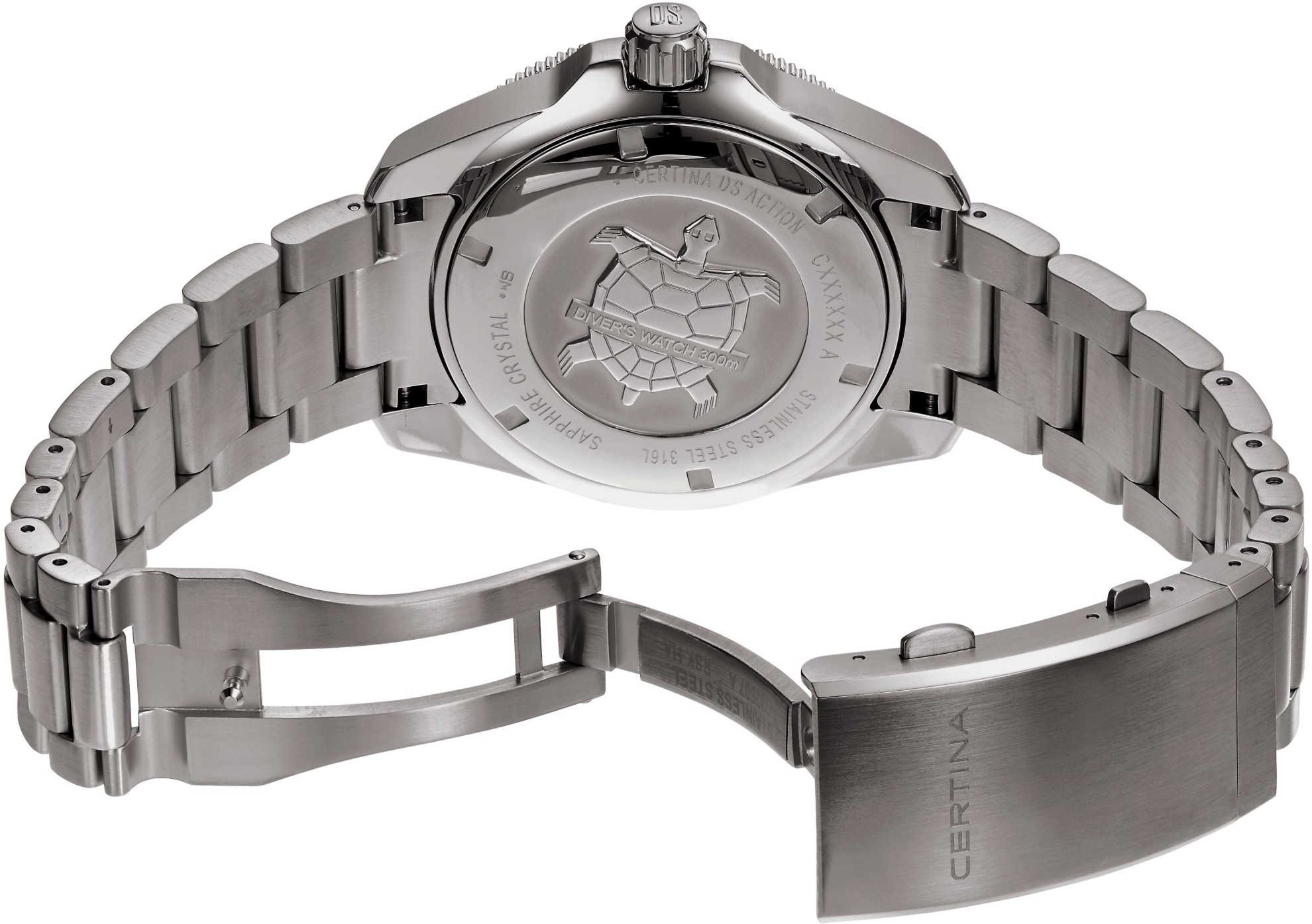 Certina DS Action Diver Powermatic 80 C032.607.44.051.00 jsou pánské automatické hodinky na titanovém náramku s překlápěcí sponou a integrovanou potápěčskou extenzí neboli možností prodloužení pro případ potápění s neoprenem. Pouzdro z titanu má průměr 43 milimetrů a jednosměrně otočnou lunetu s keramickou vložkou s potápěčskou stupnicí. Dýnko značené logem ve tvaru želvy reprezentuje robustnost a dlouhou životnost hodinek Certina. Černý číselník s indikací data je chráněn odolným safírovým sklem s antireflexní vrstvou. Aplikované hodinové indexy i ručky jsou pokryty hnědým luminiscenčním nátěrem Super-LumiNova®, který garantuje perfektní čitelnost za zhoršených světelných podmínek. Pohon hodinek zajišťuje mechanický strojek Powermatic 80.611 s automatickým nátahem a rezervou chodu přibližně 80 hodin. Kalibr je vybaven vláskem setrvačky Nivachron™, což je speciální antimagnetický materiál, díky kterému jsou hodinky velmi odolné vůči magnetickým polím. Tento strojek s funkcí hackingu lze v případě potřeby natahovat i ručně pomocí šroubovací korunky. Model disponuje technologií DS (Double Security) používanou a zdokonalovanou již od roku 1959, díky které mají hodinky zvýšenou odolnost vůči nárazům a vodě. Vodotěsnost hodinek činí 30 ATM a s certifikací ISO 6425 jsou vhodnou volbou pro přístrojové potápění.
