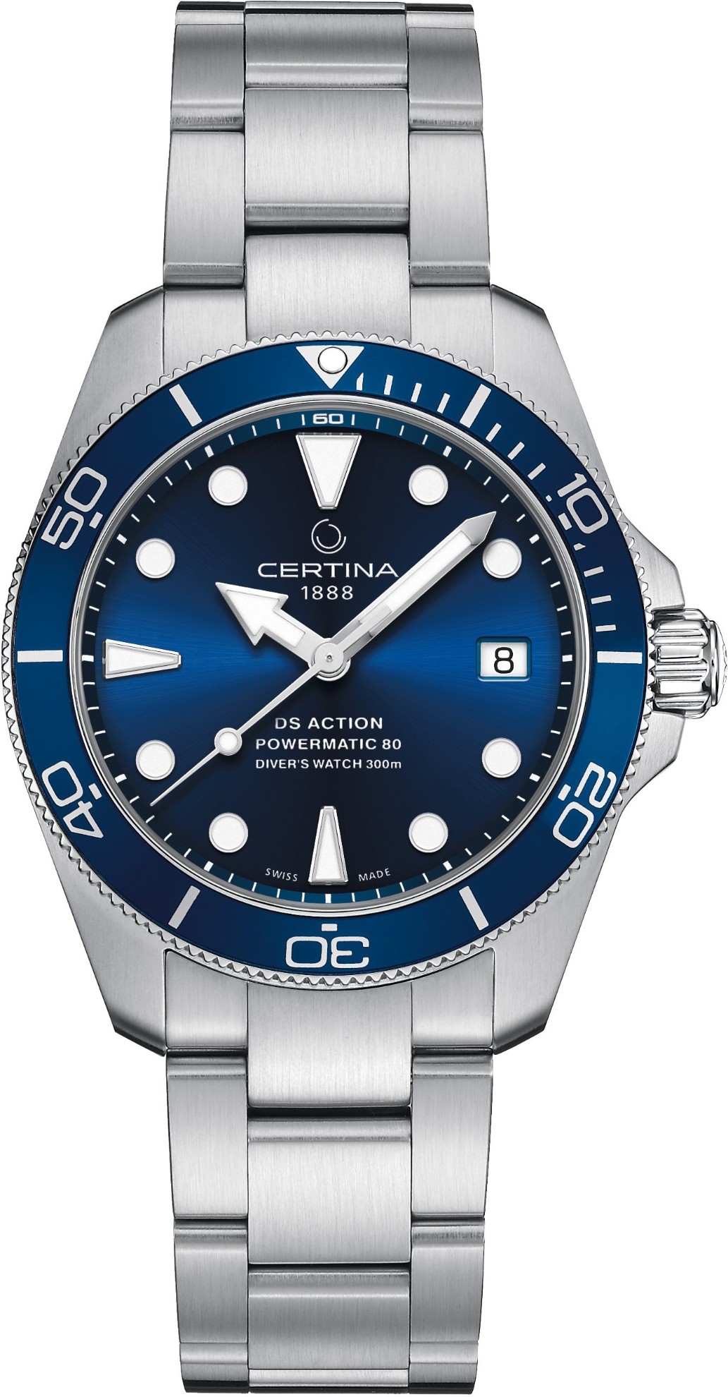 Certina DS Action Diver Powermatic 80 C032.807.11.041.00 jsou automatické hodinky na kovovém náramku s překlápěcí sponou. Pouzdro z nerezové oceli má průměr 38 milimetrů, jednosměrně otočnou lunetu s hliníkovou vložkou s potápěčskou stupnicí a dýnko značené logem ve tvaru želvy, které reprezentuje robustnost a dlouhou životnost hodinek Certina. Modrý číselník s efektem slunečního brusu a indikací data je chráněn odolným safírovým sklem s antireflexní vrstvou. Aplikované hodinové indexy jsou spolu s ručkami pokryty luminiscenčním nátěrem Super-LumiNova®, který garantuje perfektní čitelnost za zhoršených světelných podmínek. Pohon hodinek zajišťuje mechanický strojek Powermatic 80.611 s automatickým nátahem a rezervou chodu přibližně 80 hodin. Kalibr je vybaven vláskem setrvačky Nivachron, což je speciální antimagnetický materiál, díky kterému jsou hodinky velmi odolné vůči magnetickým polím. Tento strojek s funkcí hackingu lze v případě potřeby natahovat i ručně pomocí šroubovací korunky. Model disponuje technologií DS (Double Security) používanou a zdokonalovanou již od roku 1959, díky které mají hodinky zvýšenou odolnost vůči nárazům a vodě. Vodotěsnost hodinek činí 30 ATM a s certifikací ISO 6425 jsou vhodnou volbou pro přístrojové potápění.