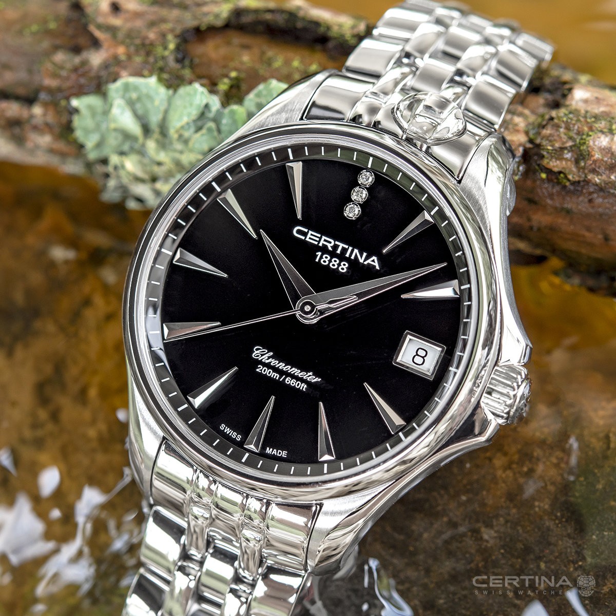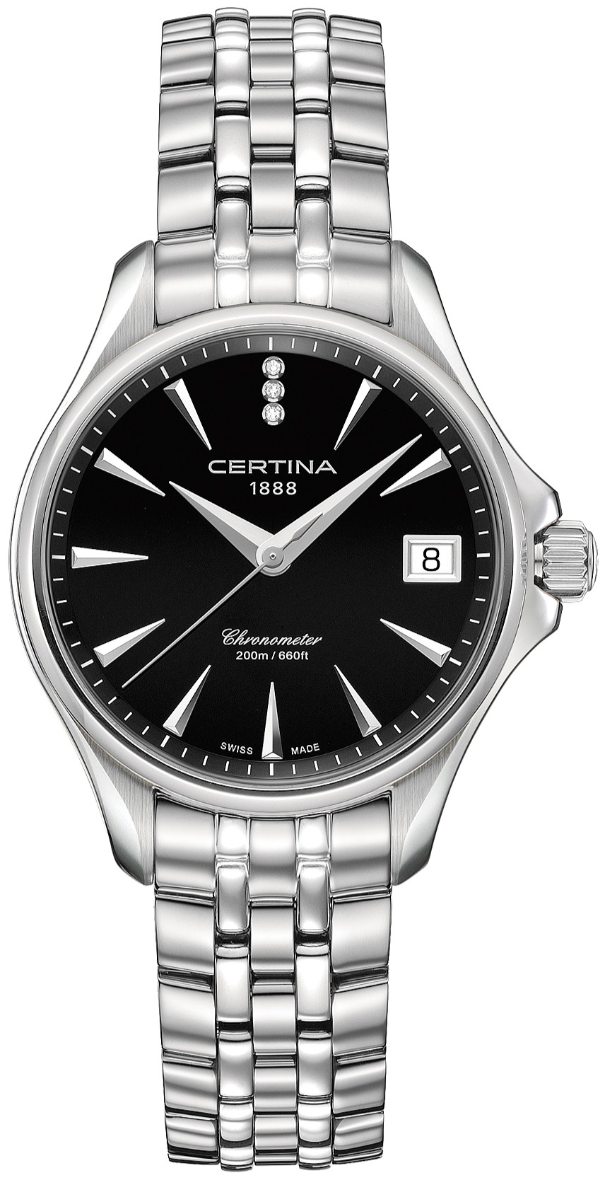 Certina DS Action Lady Chronometer C032.051.11.056.00 jsou dámské bateriové hodinky na ocelovém náramku s motýlkovou sponou. Pouzdro z nerezové oceli má průměr 33,8 milimetru, šroubovací korunku a dýnko značené logem ve tvaru želvy, které reprezentuje robustnost a dlouhou životnost hodinek Certina. Černý číselník s indikací data je chráněn odolným safírovým sklem s antireflexní vrstvou. Aplikované hodinové indexy doplňují elegantní výrazné ručky a tři diamanty na dvanácté hodině. Pohon hodinek zajišťuje spolehlivý quartzový strojek ETA F06.411 s technologií Precidrive s přesností +/- 10 sekund za rok a indikací slabé baterie. Hodinky s C.O.S.C. certifikací, která je zárukou vysoké přesnosti, nesou označení „Chronometer“. Model disponuje technologií DS (Double Security) používanou a zdokonalovanou již od roku 1959, díky které mají hodinky zvýšenou odolnost vůči nárazům a vodě. Vodotěsnost hodinek činí 20 ATM a jsou tedy vhodnou volbou pro šnorchlování a potápění.