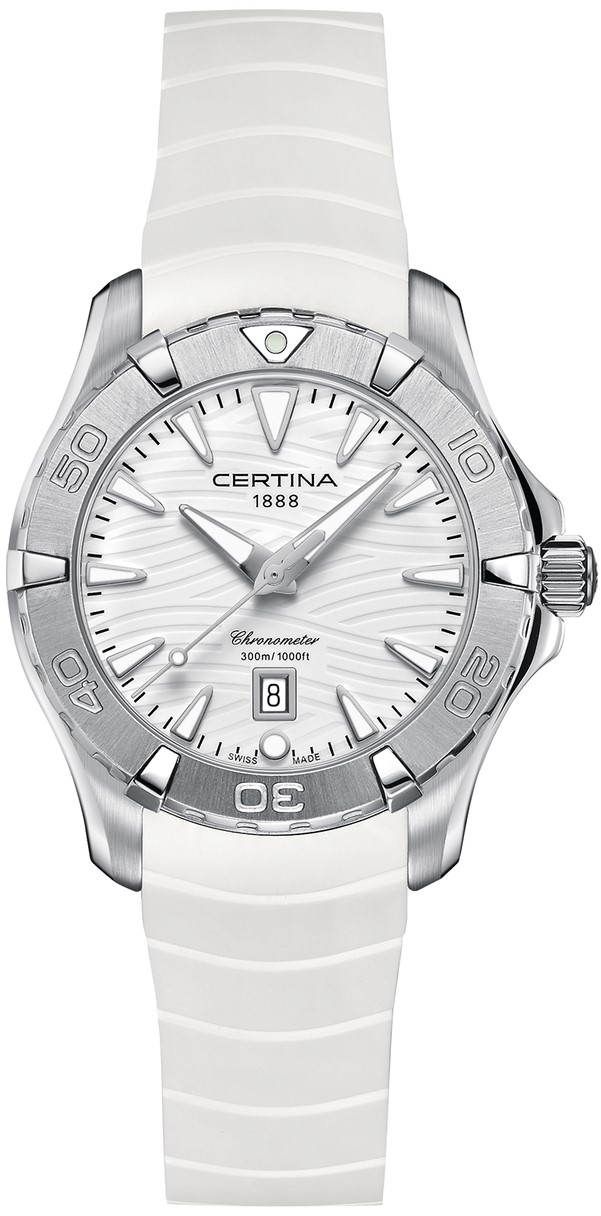 Certina DS Action Lady Chronometer C032.251.17.011.00 jsou dámské bateriové hodinky na gumovém řemínku s překlápěcí sponou. Pouzdro z nerezové oceli v kombinaci brusu a lesku má průměr 34,3 milimetru, šroubovací korunku a jednosměrně otočnou lunetu s leštěnými prvky nebo satinováním a potápěčskou stupnicí. Dýnko značené logem ve tvaru želvy reprezentuje robustnost a dlouhou životnost hodinek Certina. Bílý číselník s motivem vln a indikací data je chráněn odolným safírovým sklem s antireflexní vrstvou. Aplikované hodinové indexy jsou spolu s ručkami pokryty luminiscenčním nátěrem Super-LumiNova®, který garantuje perfektní čitelnost za zhoršených světelných podmínek. Pohon hodinek zajišťuje spolehlivý quartzový strojek ETA F04.411 s technologií Precidrive s přesností +/- 10 sekund za rok a indikací slabé baterie. Hodinky s C.O.S.C. certifikací, která je zárukou vysoké přesnosti, nesou označení „Chronometer“. Model disponuje technologií DS (Double Security) používanou a zdokonalovanou již od roku 1959, díky které mají hodinky zvýšenou odolnost vůči nárazům a vodě. Vodotěsnost hodinek činí 30 ATM a jsou tak vhodnou volbou pro šnorchlování a hlubinné potápění.
