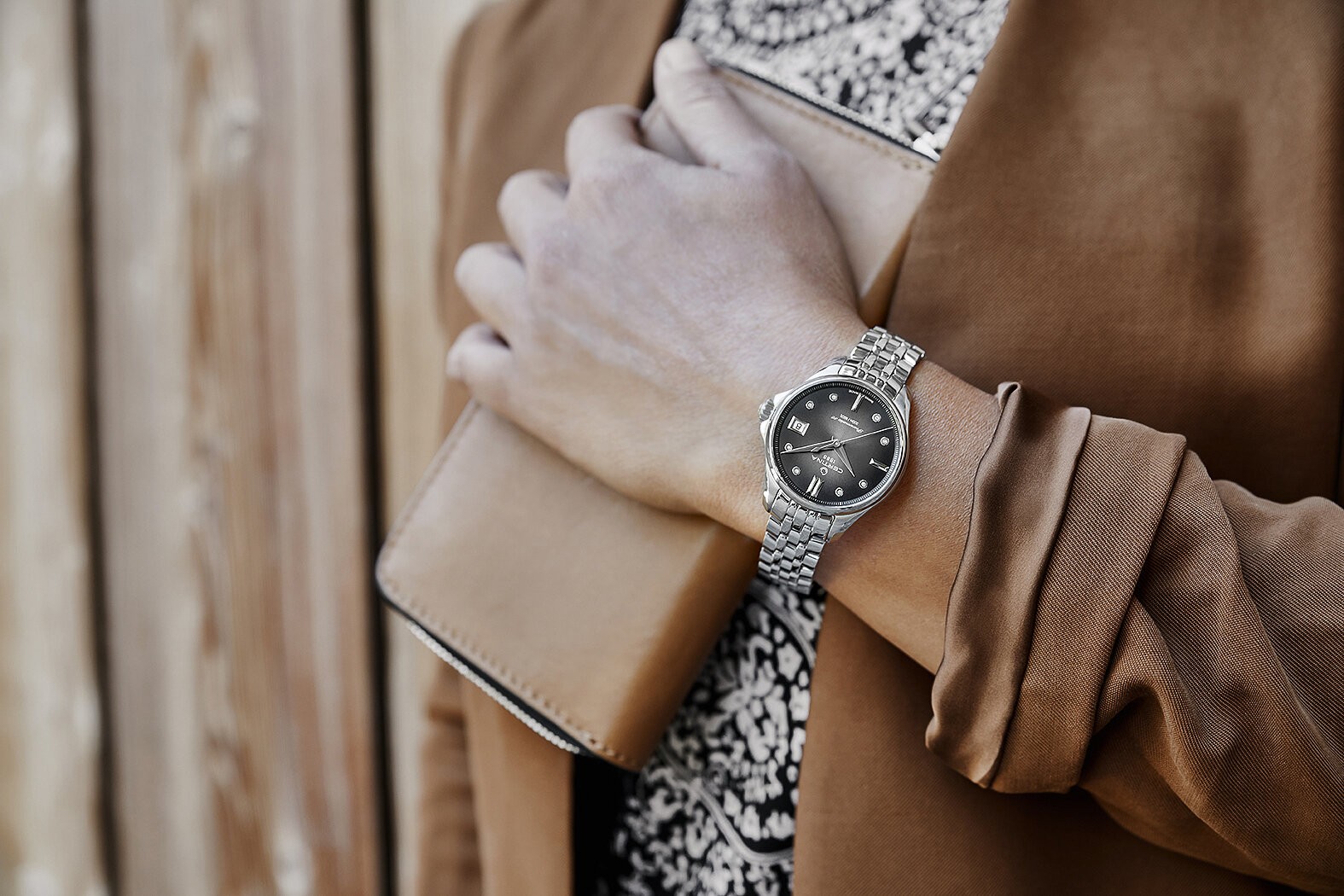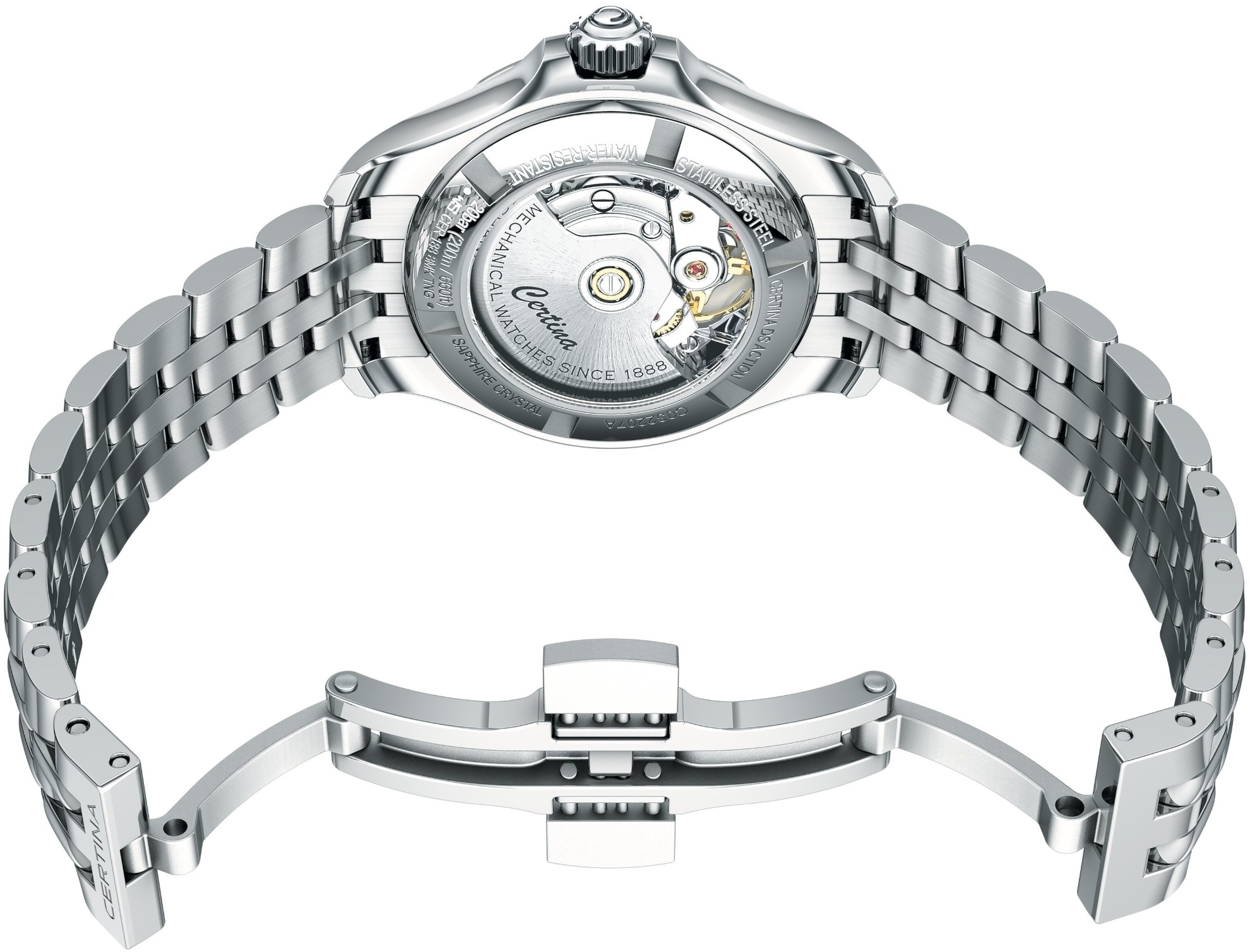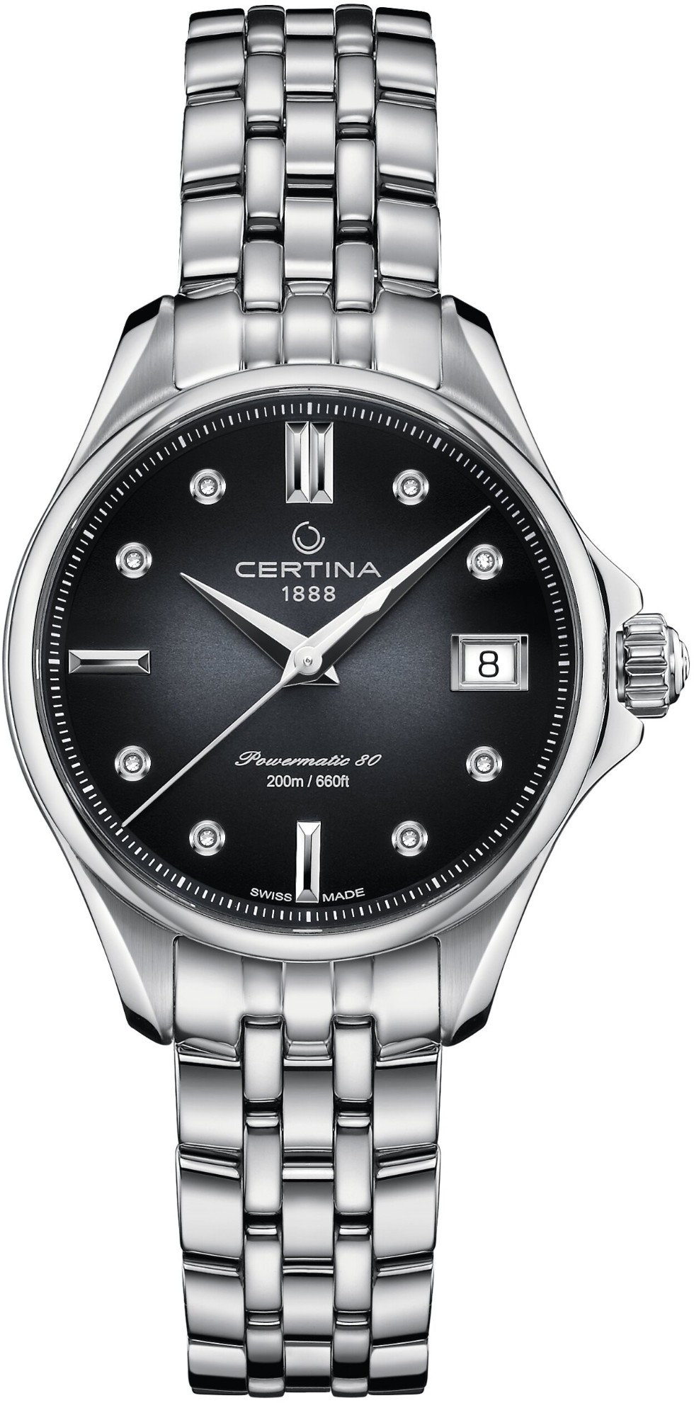 Certina DS Action Lady Powermatic 80 C032.207.11.056.00 jsou dámské automatické hodinky na kovovém náramku s motýlkovou sponou. Pouzdro z nerezové oceli má průměr 34,5 milimetru a průhledné dýnko. Černý gradientní číselník s indikací data je chráněn odolným safírovým sklem s antireflexní vrstvou. Aplikované hodinové indexy s ručkami ve stříbrné barvě doplňuje 8 diamantů. Pohon hodinek zajišťuje mechanický strojek Powermatic 80.611 s automatickým nátahem a rezervou chodu přibližně 80 hodin. Tento kalibr je vybaven vláskem setrvačky Nivachron™, což je speciální antimagnetický materiál, díky kterému jsou hodinky velmi odolné vůči magnetickým polím. Jedná se o strojek s funkcí hackingu, který lze v případě potřeby natahovat i ručně pomocí signované korunky. Model disponuje technologií DS (Double Security) používanou a zdokonalovanou již od roku 1959, díky které jsou hodinky odolnější vůči nárazům a mají zvýšenou voděodolnost. Vodotěsnost hodinek činí 20 ATM a jsou tak vhodnou volbou pro šnorchlování a potápění.