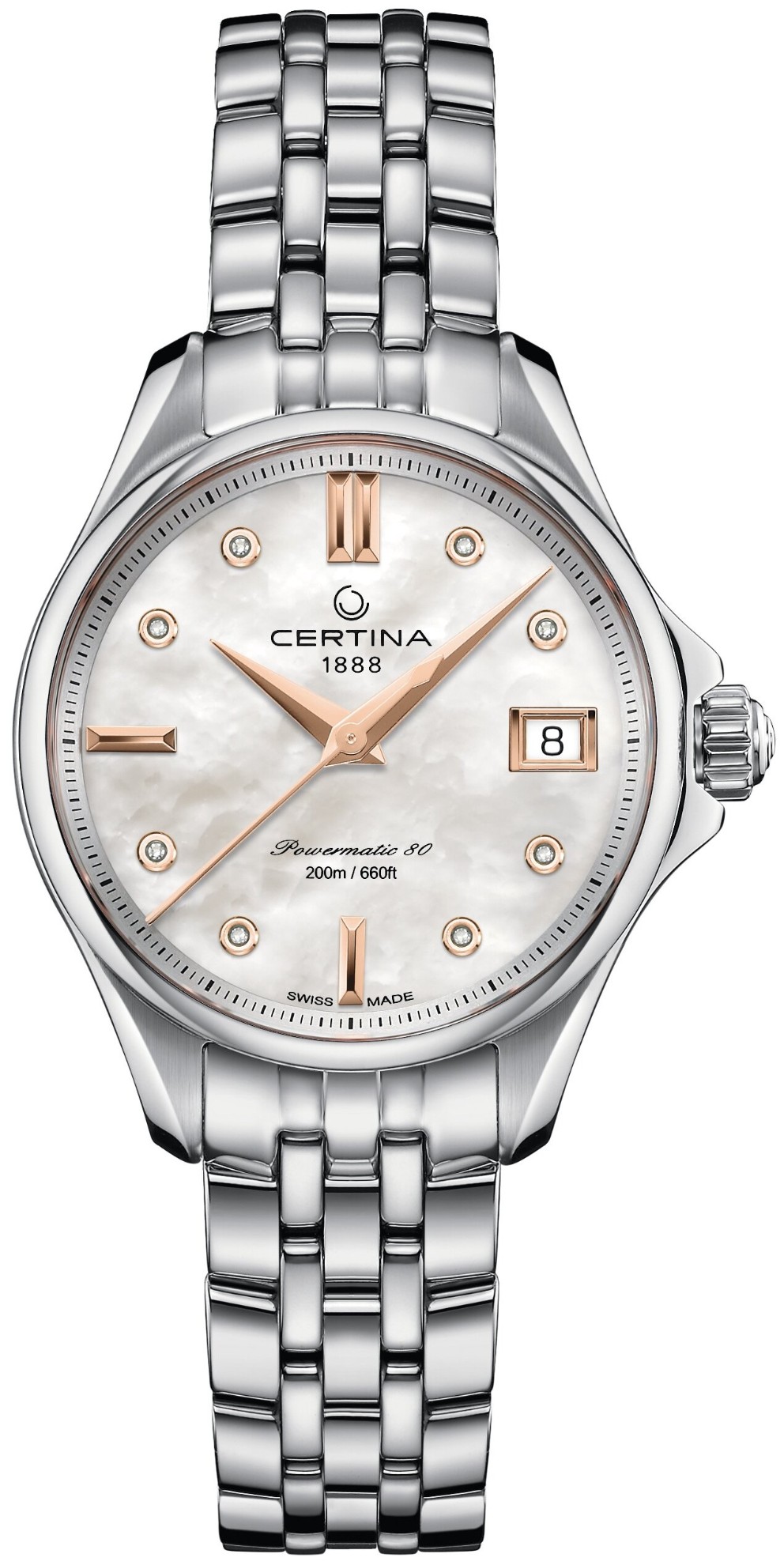 Certina DS Action Lady Powermatic 80 C032.207.11.116.00 jsou dámské automatické hodinky na kovovém náramku s motýlkovou sponou. Pouzdro z nerezové oceli má průměr 34,5 milimetru a průhledné dýnko. Perleťový číselník s indikací data je chráněn odolným safírovým sklem s antireflexní vrstvou a jeho krása vyniká zejména pod přímým světlem, kdy můžeme pozorovat hru barev perleti. Aplikované hodinové indexy s ručkami v barvě růžového zlata doplňuje 8 diamantů. Pohon hodinek zajišťuje mechanický strojek Powermatic 80.611 s automatickým nátahem a rezervou chodu přibližně 80 hodin. Tento kalibr je vybaven vláskem setrvačky Nivachron, což je speciální antimagnetický materiál, díky kterému jsou hodinky velmi odolné vůči magnetickým polím. Jedná se o strojek s funkcí hackingu, který lze v případě potřeby natahovat i ručně pomocí signované korunky. Model disponuje technologií DS (Double Security) používanou a zdokonalovanou již od roku 1959, díky které jsou hodinky odolnější vůči nárazům a mají zvýšenou voděodolnost. Vodotěsnost hodinek činí 20 ATM a jsou tak vhodnou volbou pro šnorchlování a potápění.