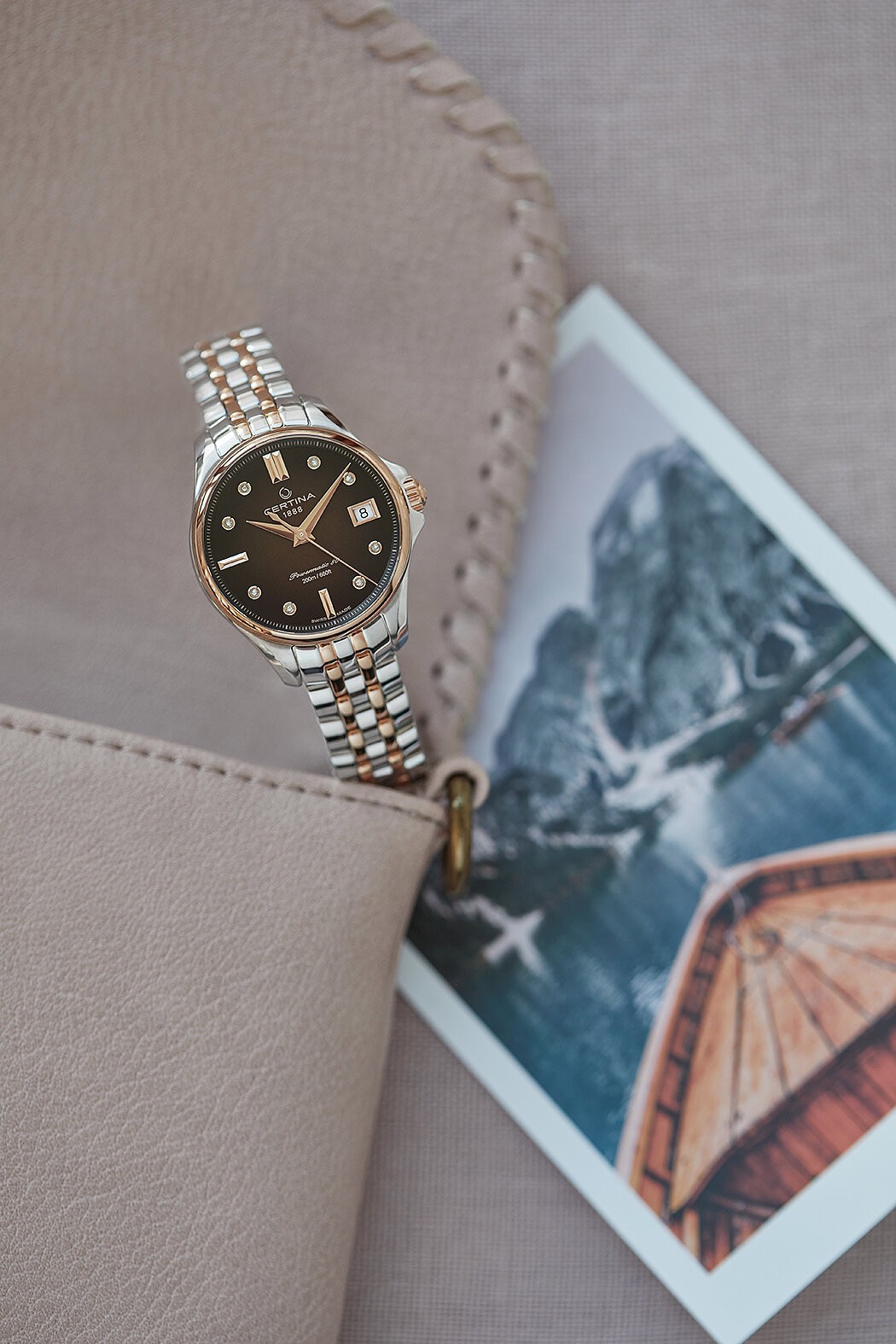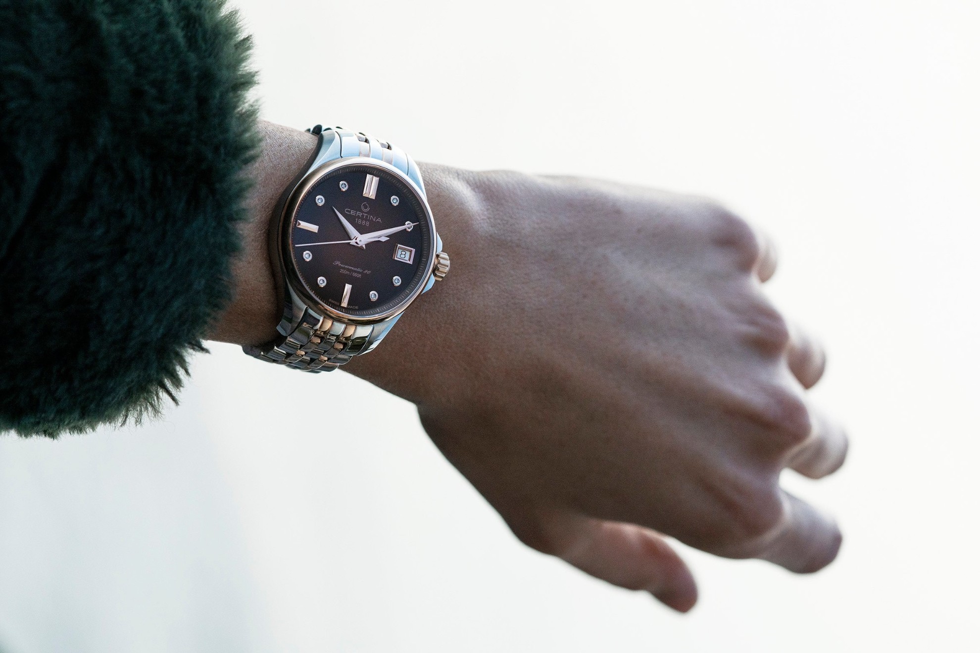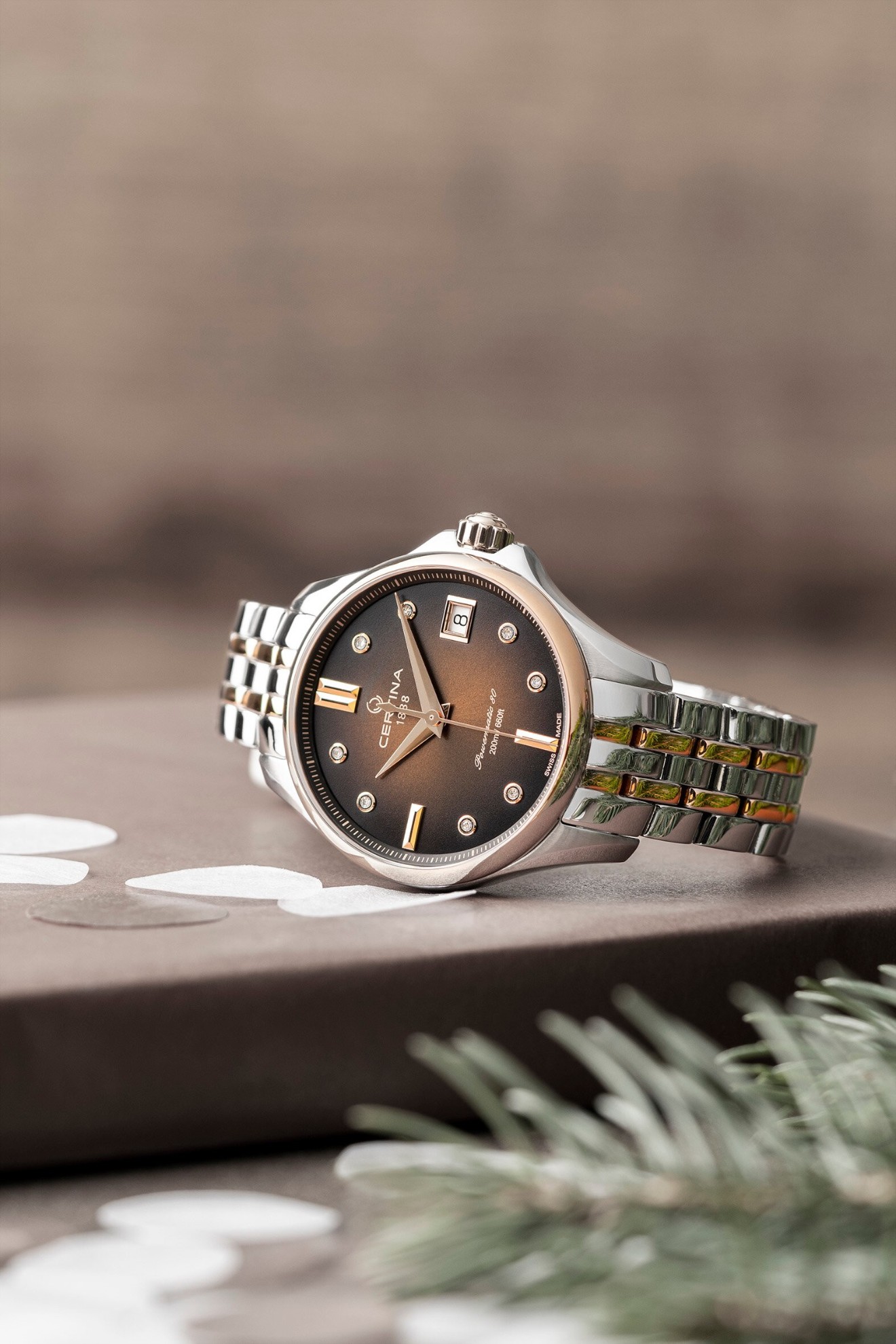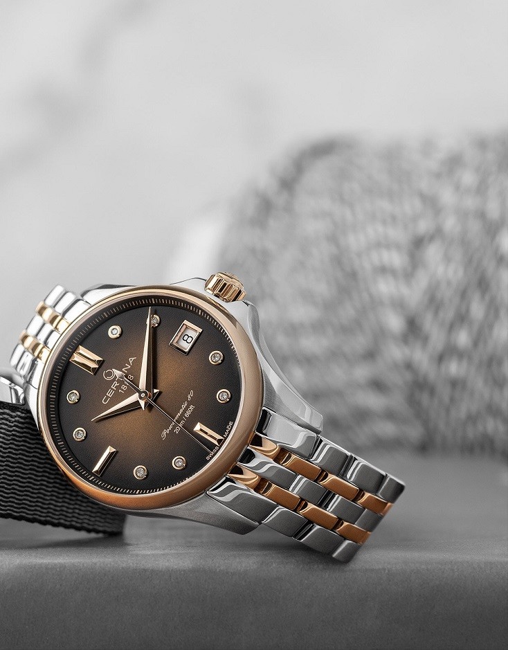 Certina DS Action Lady Powermatic 80 C032.207.22.296.00 jsou dámské automatické hodinky na kovovém bicolor náramku s motýlkovou sponou. Pouzdro z nerezové oceli má průměr 34,5 milimetru, vnější lunetu a korunku s PVD úpravou v barvě růžového zlata a průhledné dýnko. Hnědý gradientní číselník s indikací data je chráněn odolným safírovým sklem s antireflexní vrstvou. Aplikované hodinové indexy s ručkami v barvě růžového zlata doplňuje 8 diamantů. Pohon hodinek zajišťuje mechanický strojek Powermatic 80.611 s automatickým nátahem a rezervou chodu přibližně 80 hodin. Tento kalibr je vybaven vláskem setrvačky Nivachron™, což je speciální antimagnetický materiál, díky kterému jsou hodinky velmi odolné vůči magnetickým polím. Jedná se o strojek s funkcí hackingu, který lze v případě potřeby natahovat i ručně pomocí signované korunky. Model disponuje technologií DS (Double Security) používanou a zdokonalovanou již od roku 1959, díky které jsou hodinky odolnější vůči nárazům a mají zvýšenou voděodolnost. Vodotěsnost hodinek činí 20 ATM a jsou tak vhodnou volbou pro šnorchlování a potápění.