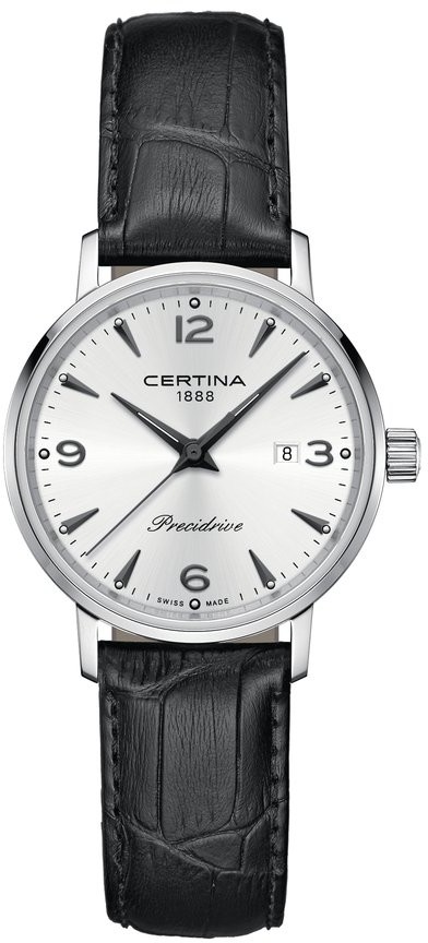 Certina DS Caimano Lady C035.210.16.037.00 jsou dámské bateriové hodinky na černém koženém řemínku s trnovou sponou. Pouzdro z nerezové oceli má průměr 28 milimetrů a dýnko značené logem ve tvaru želvy, které reprezentuje robustnost a dlouhou životnost hodinek Certina. Stříbrný číselník s efektem slunečního brusu a indikací data je chráněn odolným safírovým sklem s antireflexní vrstvou. Aplikované hodinové indexy a ručky jsou pokryty luminiscenčním nátěrem Super-LumiNova®, který garantuje perfektní čitelnost za zhoršených světelných podmínek. Pohon hodinek zajišťuje quartzový strojek ETA F03.412 s technologií Precidrive s přesností +/- 10 sekund za rok a indikací slabé baterie. Model disponuje technologií DS (Double Security) používanou a zdokonalovanou již od roku 1959, díky které mají hodinky zvýšenou odolnost vůči nárazům a vodě. Vodotěsnost hodinek činí 10 ATM a jsou tedy vhodné pro koupání nebo šnorchlování.