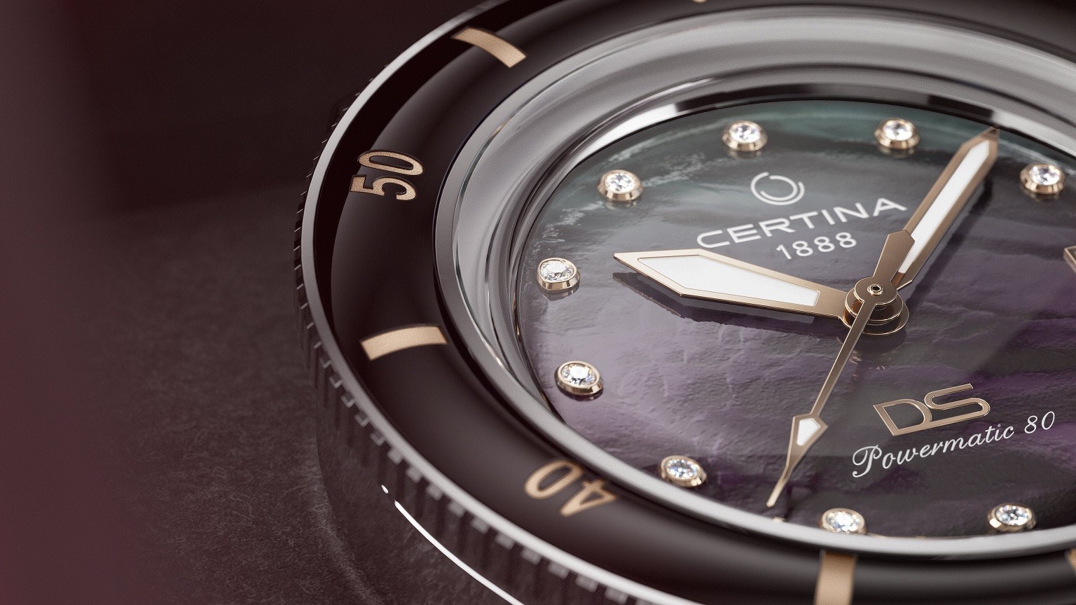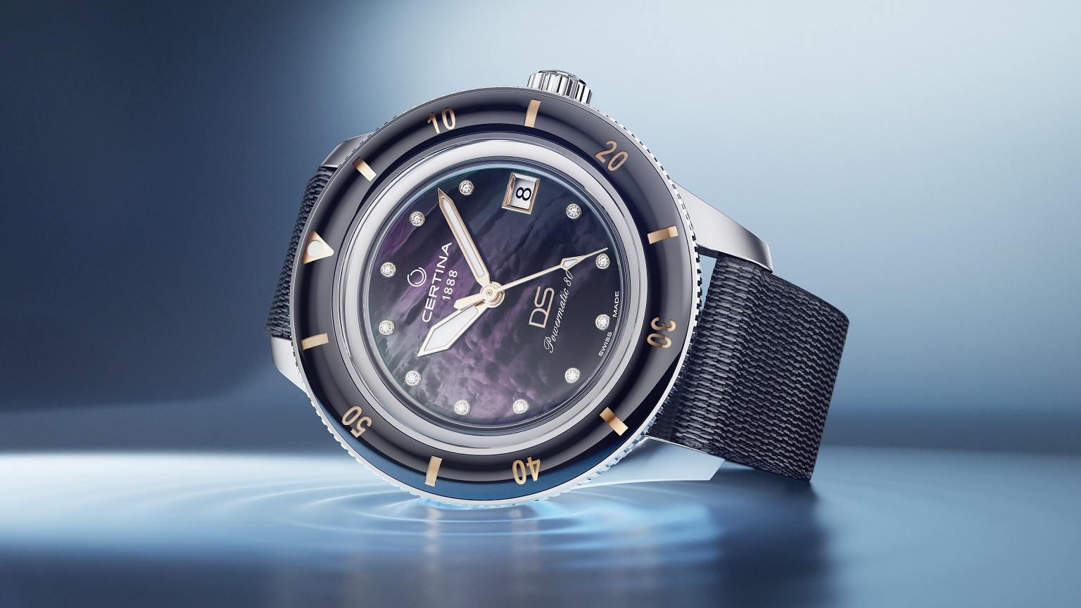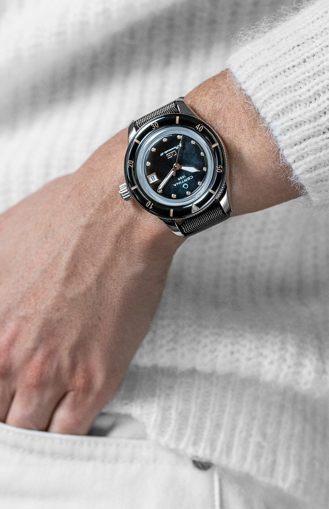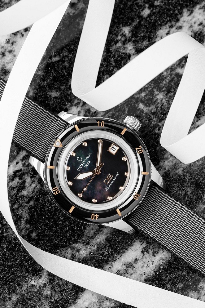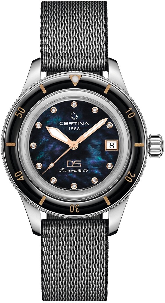 Certina DS PH200M Powermatic 80 C036.207.18.126.00 jsou dámské automatické hodinky na textilním řemínku z materiálu #tide ocean, který spojuje dobrý vzhled s dobrou věcí: materiál je vyroben z plastů vylovených ze světových oceánů. Hodinky svým designem navazují na dnes již kultovní model PH200M z roku 1967. Pouzdro z nerezové oceli v kombinaci brusu a lesku má průměr 39 milimetrů, jednosměrně otočnou lunetu s jemně vypouklou keramickou vložkou s potápěčskou stupnicí a průhledné dýnko. Modro-černý perleťový číselník s indikací data je chráněn vypouklým safírovým sklem s antireflexní vrstvou a jeho krása vyniká zejména pod přímým světlem, kdy můžeme pozorovat hru barev perleti. Hodinové indexy jsou tvořeny 11 diamanty a ručky s částí lunety jsou pokryty luminiscenčním nátěrem Super-LumiNova®, který garantuje perfektní čitelnost za zhoršených světelných podmínek. Pohon hodinek zajišťuje mechanický strojek Powermatic 80.611 s automatickým nátahem a rezervou chodu přibližně 80 hodin. Kalibr je vybaven vláskem setrvačky Nivachron™, což je speciální antimagnetický materiál, díky kterému jsou hodinky velmi odolné vůči magnetickým polím. Tento strojek s funkcí hackingu lze v případě potřeby natahovat i ručně pomocí šroubovací korunky. Model disponuje technologií DS (Double Security) používanou a zdokonalovanou již od roku 1959, díky které mají hodinky zvýšenou odolnost vůči nárazům a vodě. Vodotěsnost hodinek činí 20 ATM a jsou tak vhodnou volbou pro šnorchlování a potápění.