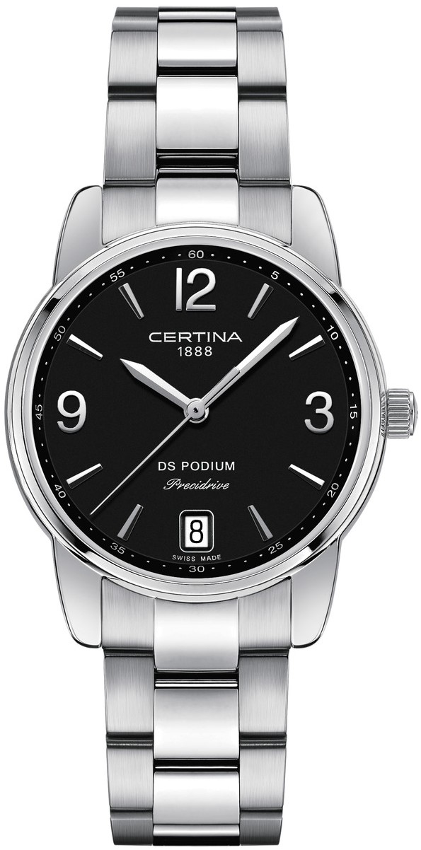 Certina DS Podium Lady C034.210.11.057.00 jsou dámské bateriové hodinky na kovovém náramku v kombinaci brusu a lesku s motýlkovou sponou. Pouzdro z nerezové oceli má průměr 33 milimetrů a dýnko značené logem ve tvaru želvy, které reprezentuje robustnost a dlouhou životnost hodinek Certina. Černý číselník s indikací data je chráněn odolným safírovým sklem s antireflexní vrstvou. Pohon hodinek zajišťuje quartzový strojek ETA F06.411 s technologií Precidrive s přesností +/- 10 sekund za rok a indikací slabé baterie. Model disponuje technologií DS (Double Security) používanou a zdokonalovanou již od roku 1959, díky které mají hodinky zvýšenou odolnost vůči nárazům a vodě. Vodotěsnost hodinek činí 10 ATM a jsou tedy vhodné pro koupání nebo šnorchlování.