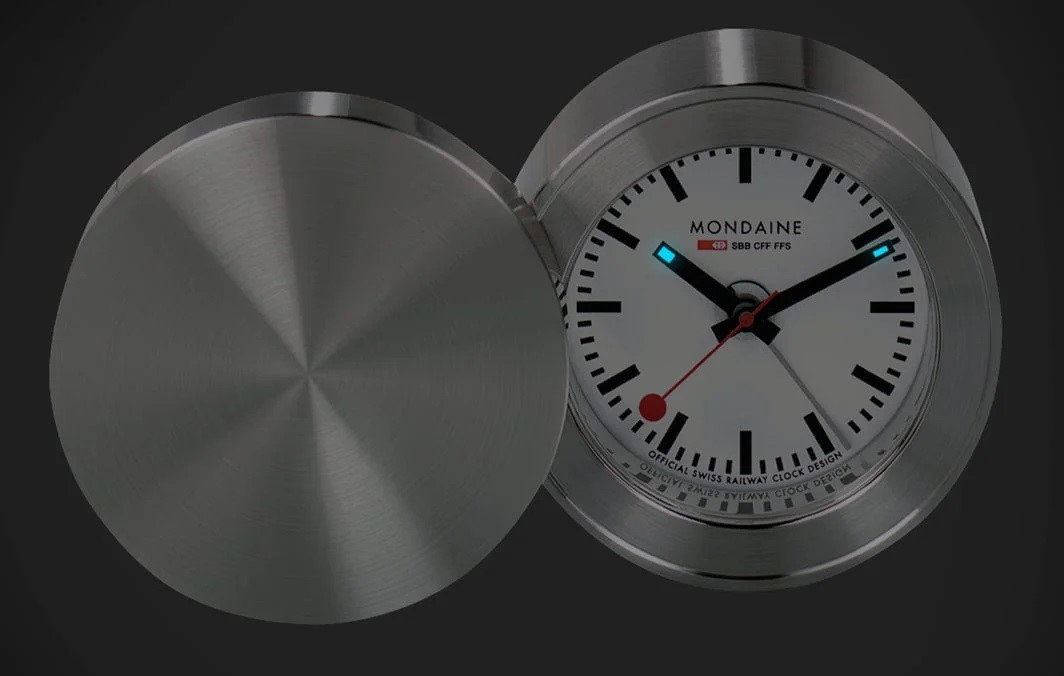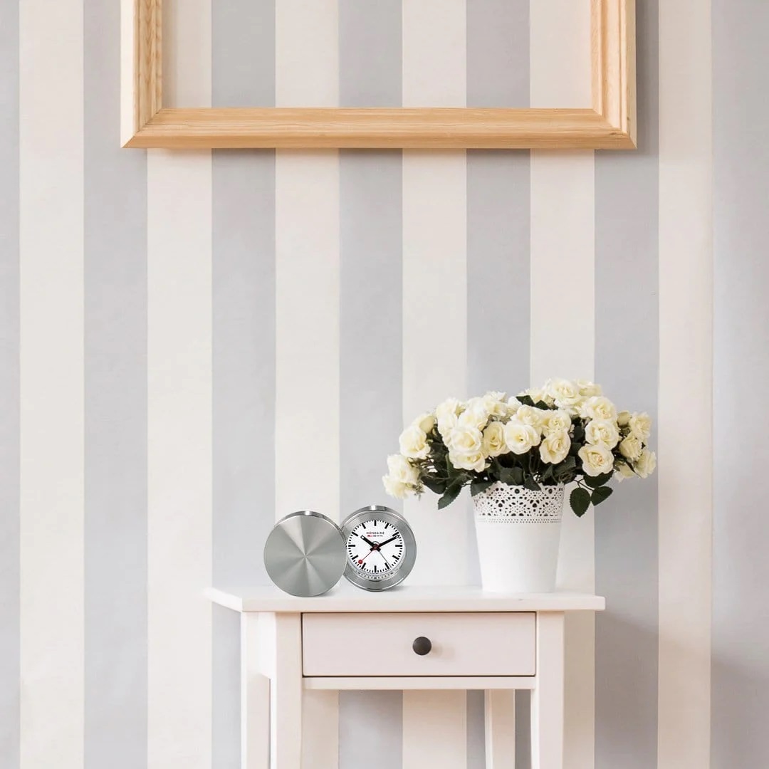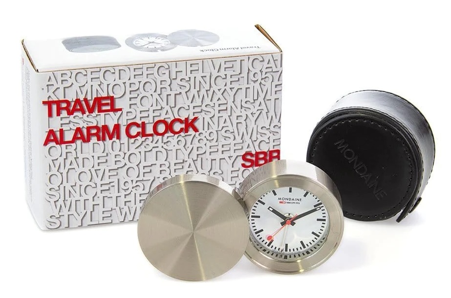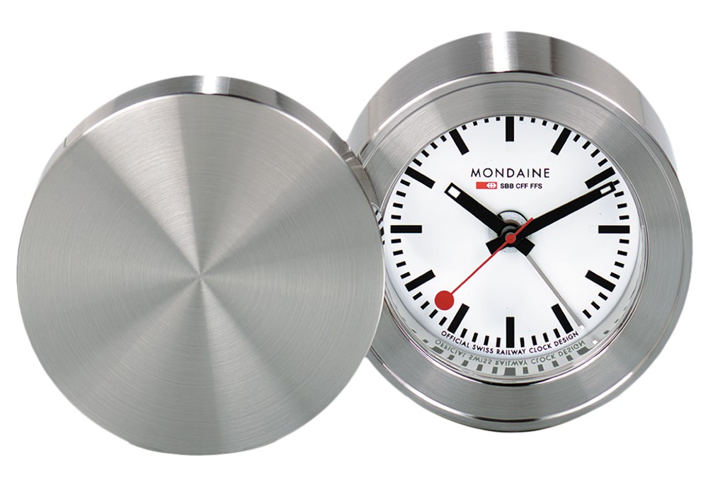 MONDAINE MSM.64410 je cestovní budík jehož kovové pouzdro má průměr 50 milimetrů a tloušťku 26 milimetrů. Přehledný číselník v bílé barvě je chráněn tvrzeným minerálním sklem a je inspirován ikonickými nádražními hodinami s červenou sekundovou ručkou. Konce hodinové a minutové ručky disponují luminiscenčním nátěrem, který usnadňuje čitelnost ve tmě. Chod hodin zajišťuje quartzový strojek.