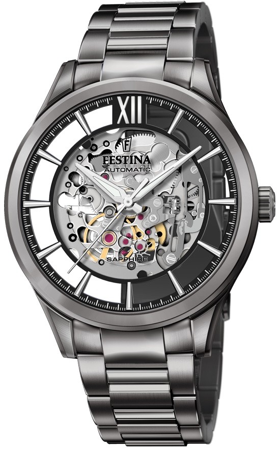 Festina Automatic Skeleton 20632/1 jsou pánské klasické mechanické hodinky na ocelovém náramku s matnou tmavě šedou PVD úpravou a překlápěcí sponou. Pouzdro z nerezové oceli ve stejné barvě má průměr 42,8 milimetru. Ručičky a indexy disponují luminiscenčním nátěrem, který po nasvícení usnadňuje čitelnost za zhoršených světelných podmínek. Skeletonový číselník chráněný odolným safírovým sklíčkem nabízí spolu s průhledným dýnkem pohled na mechanický strojek Miyota 8N24 s automatickým nátahem a rezervou chodu až 42 hodin. Vodotěsnost hodinek činí 5 ATM a jsou tedy odolné proti dešti a při sprchování.