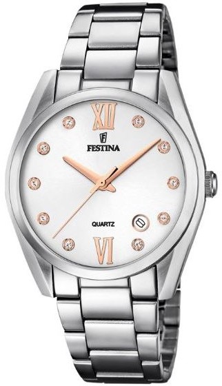 Festina Boyfriend Collection 16790/A jsou dámské bateriové hodinky v klasickém designu s ocelovým náramkem vhodné pro každodenní nošení. Pouzdro z nerezové oceli má průměr 36,8 milimetru. Stříbrný číselník s ukazatelem data zdobený čirými zirkony a římskými číslicemi v barvě růžového zlata je chráněn odolným minerálním sklíčkem. Pohon zajišťuje quartzový strojek Miyota 2115. Vodotěsnost hodinek činí 5 ATM a jsou tedy odolné proti dešti a při sprchování.