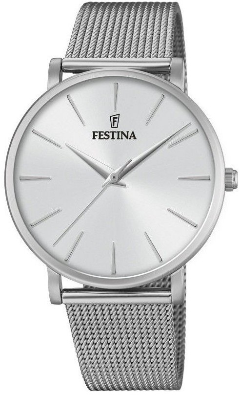 Festina Boyfriend Collection 20475/1 jsou dámské elegantní quartzové hodinky na ocelovém milánském tahu. Stříbrný číselník s efektem slunečního brusu je chráněn odolným minerálním sklíčkem a ocelovým pouzdrem o průměru 38 milimetrů. Chod hodinek zajišťuje bateriový strojek Miyota Gl30. S vodotěsností 3 ATM jsou hodinky odolné proti dešti a při mytí rukou.