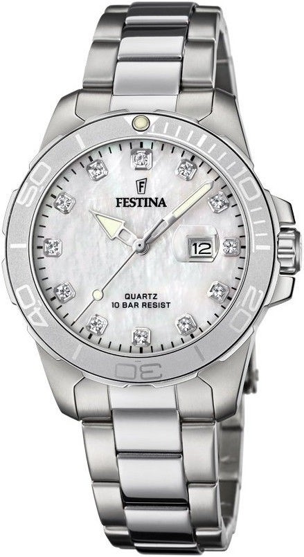 Festina Boyfriend Collection 20503/1 jsou dámské quartzové hodinky v klasickém designu na ocelovém náramku s překlápěcí sponou. Perleťový číselník s lupou nad aperturou data a 12 čirými zirkony je chráněn odolným minerálním sklíčkem a ocelovým pouzdrem o průměru 34,5 milimetru, které disponuje jednosměrně otočnou lunetou. Snadnou čitelnost ve tmě zajišťují ručky opatřené luminiscencí. O chod hodinek se stará bateriový strojek Miyota Gl13. S vodotěsností 10 ATM jsou hodinky vhodné pro koupání nebo šnorchlování.
