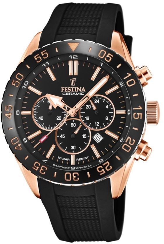 Festina Ceramic 20516/2 jsou pánské sportovní quartzové hodinky na silikonovém řemínku černé barvy. Pouzdro z nerezové oceli s PVD úpravou v barvě růžového zlata má průměr 44 milimetrů, keramickou lunetu s minutovou stupnicí a spolu s tlačítky stopek, korunkou a prvky na lunetě barevně koresponduje s ručkami, indexy a rámováním subčíselníků na černém číselníku chráněném odolným safírovým sklem. Aplikované indexy mají spolu s ručkami luminiscenční nátěr, který po nasvícení usnadňuje čitelnost za zhoršených světelných podmínek. Pohon zajišťuje quartzový strojek Miyota 0S20 s mimostřednou průběžnou sekundovou ručkou na pozici 6. hodiny, s ukazatelem času ve 24hodinovém formátu na pozici 3. hodiny a s minutovým čítačem stopek na 9. hodině. Nechybí ani okénko datumovky. Vodotěsnost hodinek činí 10 ATM a jsou tedy vhodné pro koupání nebo šnorchlování.