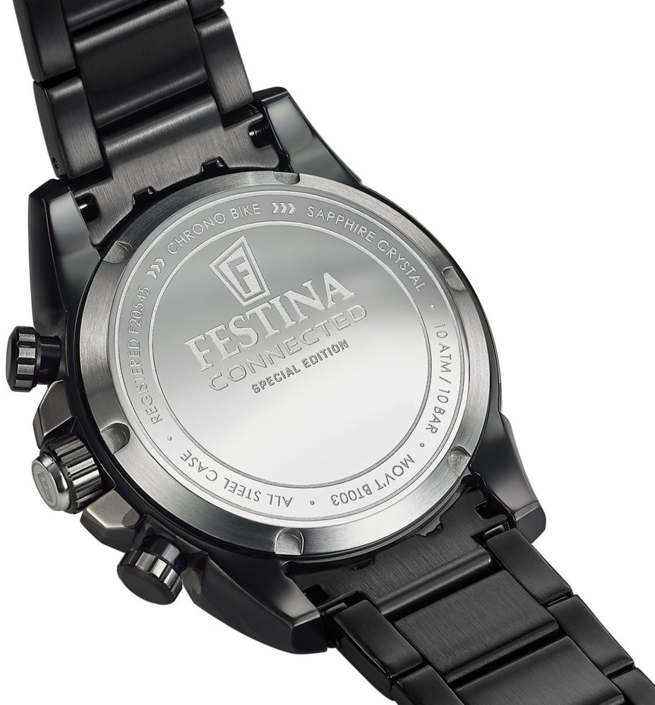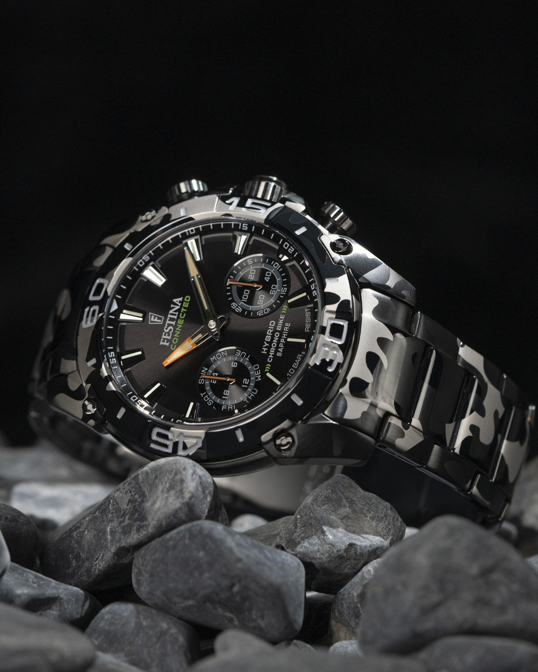 Festina Chrono Bike Connected 20545/1 jsou pánské chytré sportovní quartzové hodinky na kovovém náramku s PVD úpravou s maskáčovým vzorem ztělesňující spojení vytříbené estetiky a pokročilé funkčnosti. Ocelové pouzdro stejné barvy má průměr 45,5 milimetru a lunetu s minutovou stupnicí. Černý číselník je chráněn odolným safírovým sklem. Vodotěsnost hodinek činí 10 ATM a jsou tedy vhodné pro koupání nebo šnorchlování. Hodinky je možné propojit s vaším smartphonem pomocí aplikace Festina Connected, která je k dispozici pro systémy Android a iOS. Vynikají tím, že na první pohled nepůsobí jako běžné chytré hodinky, avšak mohou nabídnout hned 17 užitečných funkcí podrobně popsaných níže. Patří mezi ně např.: Bluetooth, krokoměr, timer, stopky, budík a spoustu dalších. Baterie má životnost přes dva roky. Součástí balení je náhradní silikonový řemínek s maskáčovým vzorem.