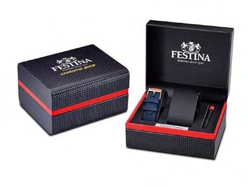 Festina Chrono Bike Special Edition '20 20524/1 jsou pánské sportovní quartzové hodinky na kovovém náramku s modrou PVD úpravou ztělesňující spojení vytříbené estetiky a pokročilé funkčnosti. Pouzdro z nerezové oceli v barvě růžového zlata má průměr 44,5 milimetru a lunetu s minutovou stupnicí. Modrý číselník je chráněn odolným minerálním sklem. Aplikované indexy mají spolu s ručkami luminiscenční nátěr, který po nasvícení usnadňuje čitelnost za zhoršených světelných podmínek. Pohon hodinek zajišťuje bateriový strojek Miyota 0S20 s mimostřednou průběžnou sekundovou ručkou na pozici 6. hodiny, s ukazatelem času ve 24hodinovém formátu na pozici 3. hodiny a s minutovým čítačem stopek na 9. hodině. Nechybí ani okénko datumovky. Vodotěsnost hodinek činí 10 ATM a jsou tedy vhodné pro koupání nebo šnorchlování. Jedná se o speciální edici, jejíž balení obsahuje náhradní silikonový řemínek v modré barvě.