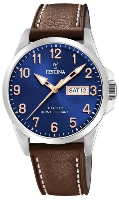 Festina Classics 20358/B jsou pánské elegantní bateriové hodinky na hnědém koženém řemínku s kontrastním prošíváním a trnovou sponou. Pouzdro z nerezové oceli má průměr 41 milimetrů. Modrý číselník s efektem slunečního brusu a ukazatelem dne a data na třetí hodině je chráněn odolným minerálním sklíčkem. Ručičky mají luminiscenční nátěr, který po nasvícení usnadňuje čitelnost za zhoršených světelných podmínek. Chod hodinek zajišťuje quartzový strojek Miyota 1S02 s přesností ±20 sekund za měsíc. S vodotěsností 10 ATM jsou hodinky vhodné pro plavání či šnorchlování.