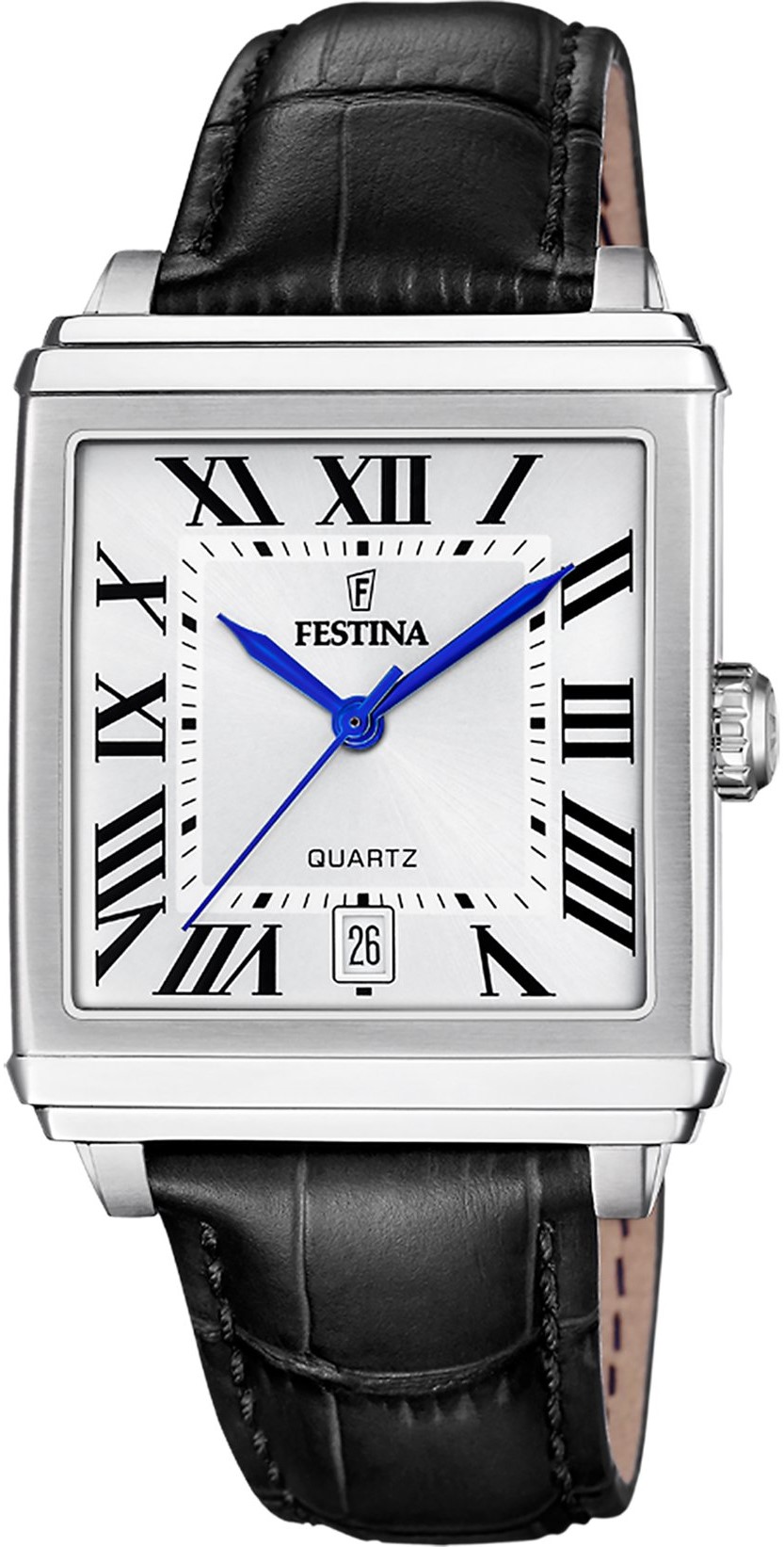 Festina Classics 20681/1 jsou pánské elegantní bateriové hodinky na černém koženém řemínku s trnovou sponou. Hranaté pouzdro z nerezové oceli je široké 33,3 milimetru. Stříbrný číselník s modrými ručkami a ukazatelem data na šesté hodině je chráněn odolným minerálním sklíčkem. Chod hodinek zajišťuje quartzový strojek Miyota GR12 s přesností ±20 sekund za měsíc. S vodotěsností 5 ATM jsou hodinky odolné proti dešti a při sprchování.